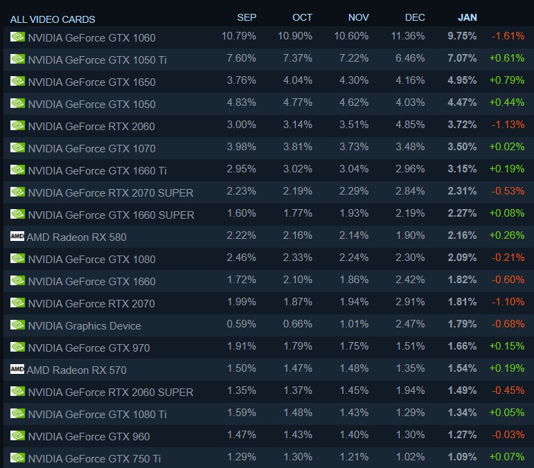 لا زالت NVIDIA تتربع على عرش البطاقات المستخدمة على المنصة وبعدها بطاقات Intel وAMD. ليس هذا فقط، بل هناك 18 بطاقة تشغر قائمة البطاقات الأكثر إنتشاراً على المنصة من NVIDIA، بينما تحل بطاقة RX 580 المركز العاشر وبطاقة RX 570 المركز السادس عشر. أعلى بطاقة منتشرة من سلسلة RTX-30 هي بطاقة RTX 3080 الحاصلة على نسبة 0.66% من جميع الأجهزة.