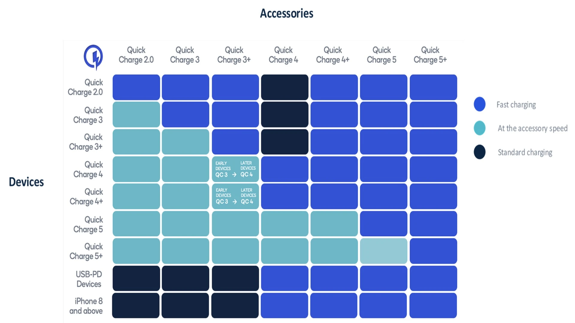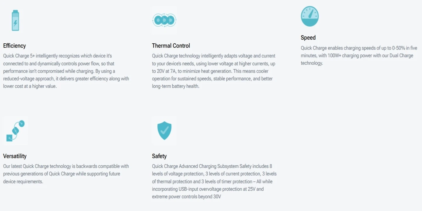 من بين أبرز ما كشفت عنه كوالكوم، دعم التوافق العكسي، حيث يمكن لشواحن Quick Charge 5+ العمل مع الأجهزة الأقدم التي تدعم QC5، إلى جانب التوافق مع معايير USB-PD PPS. وبذلك يمكن للمستخدمين الاعتماد على شاحن واحد لاستخدامه مع هواتفهم، أجهزتهم المحمولة، وسماعاتهم الذكية.