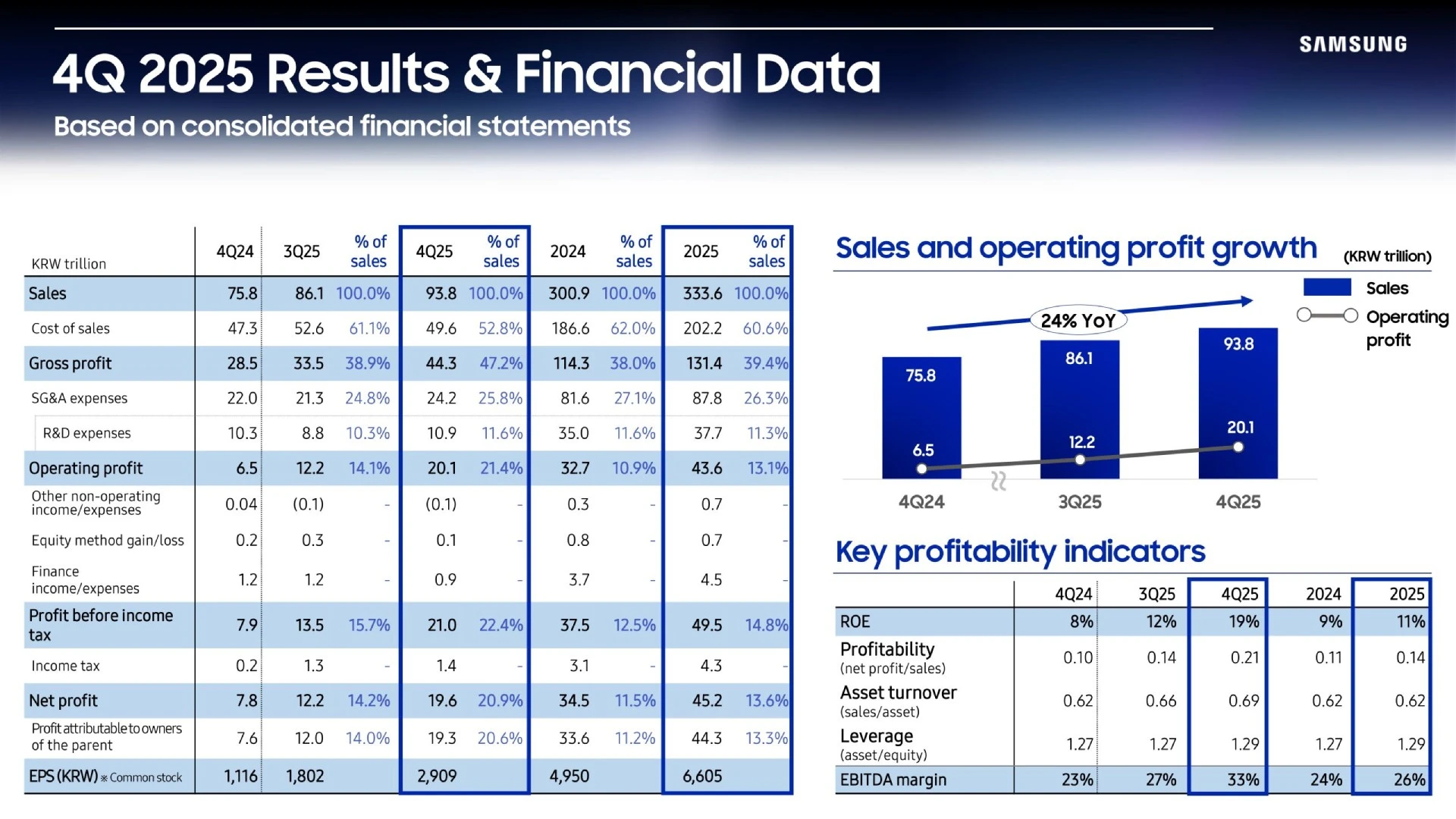 بلغت أرباح سامسونج في الربع الرابع من 2025 مُستوى قياسيًا لا يمر عادة مرور الكرام في سوق التكنولوجيا، حيث أعلنت الشركة عن تشغيل أرباح تشغيلية تقارب 20 تريليون وون نتيجة طلب هائل على شرائح الذاكرة المُخصصّة لمراكز الذكاء الاصطناعي وأسعار أعلى بسبب نُدرة العرض.
