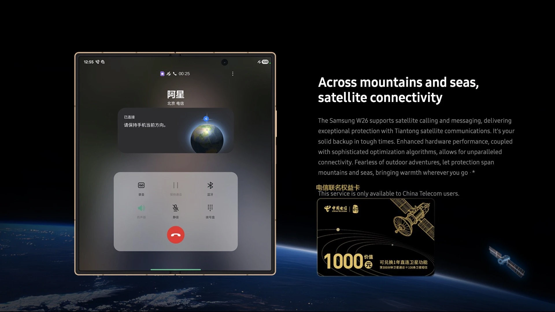 الميزة التي تفرّق Samsung W26 عن باقي سلسلة Fold هي دعمه للاتصال عبر الأقمار الصناعية، هذه التقنية تمكّنه من إرسال رسائل طوارئ أو إجراء اتصالات محدودة في المناطق التي لا تتوفر فيها تغطية شبكية. خطوة تعبّر عن توجه جديد في عالم الهواتف الذكية، حيث لم يعد المستخدم مُرتبطًا فقط بأبراج الاتصالات التقليدية.