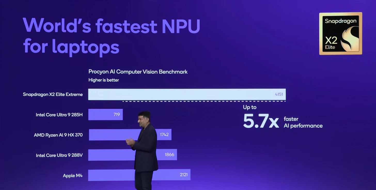 كشفت Qualcomm عن جيلها الجديد من معالجات Snapdragon X2 الموجهة للحواسيب الشخصية العاملة بنظام ويندوز من فئة "حواسيب الذكاء الاصطناعي AI PC"؛ مُدعيةً أنها تتفوق بشكل كبير على منافسيها من AMD وIntel.