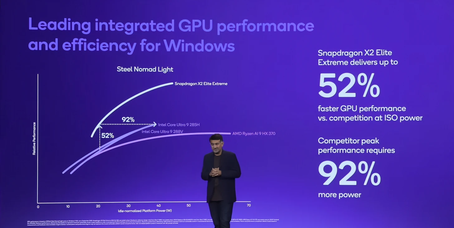 أما على المستوى الرسومي، فتقول الشركة إن معالجها الرسومي Adreno X2-90 بسرعة 1.85 جيجاهرتز يقدم أداءً أفضل بنسبة 52% عند نفس الطاقة، بينما يحتاج المنافسون إلى طاقة أعلى بنسبة 92% لمعادلة الأداء.