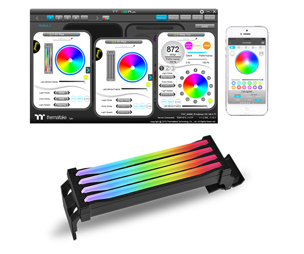 كل شريط إضاءة في هذه القطعة تتضمن 9 نقاط إضاءة RGB LED أي أن هناك 36 نقطة إضاءة على كامل القطعة مما يجعلها تنتج إضاءة قوية بمزيج من الألوان يصل إلى 16.8 مليون لون وعمرها الافتراضي يصل حتى 50 ألف ساعة, بالمناسبة نظام الإضاءة المعروف TT RGB PLUS من Thermaltake يدعم أشهر اللوحات الام مثل ASUS, GIGABYTE, MSI, AsRock من خلال منفذ 5V ويمكن التحكم بكل تلك الإضاءة من خلال تطبيق TT RGB PLUS الشامل سواء من خلال الحاسوب او الأجهزة الذكية بنظام اندرويد أو ISO. للأسف ليس هناك أي معلومات حول السعر بعد. ولكن نأمل أن لا تكون مثل حلول Corsair التي قدمت لنا ذواكر Vengeance RGB Pro Light لتركبها في مكان الذواكر كمظهر فقط حتى تغطي باقي المنافذ الخالية في لوحتك لتكون سعر القطعتين 40 دولار!! وهو سعر عجيب.