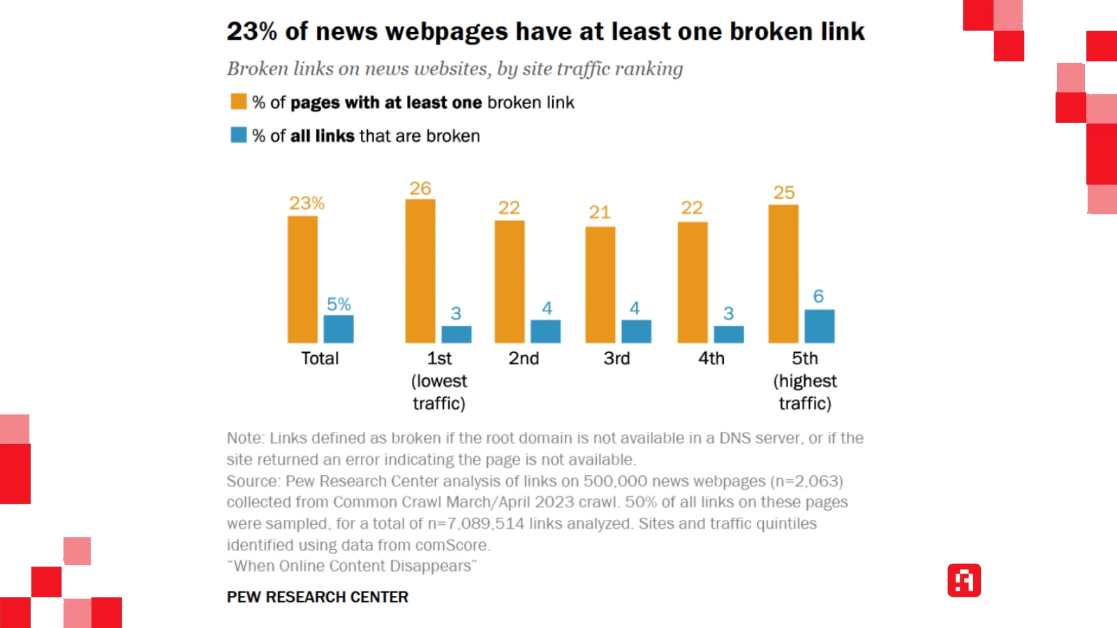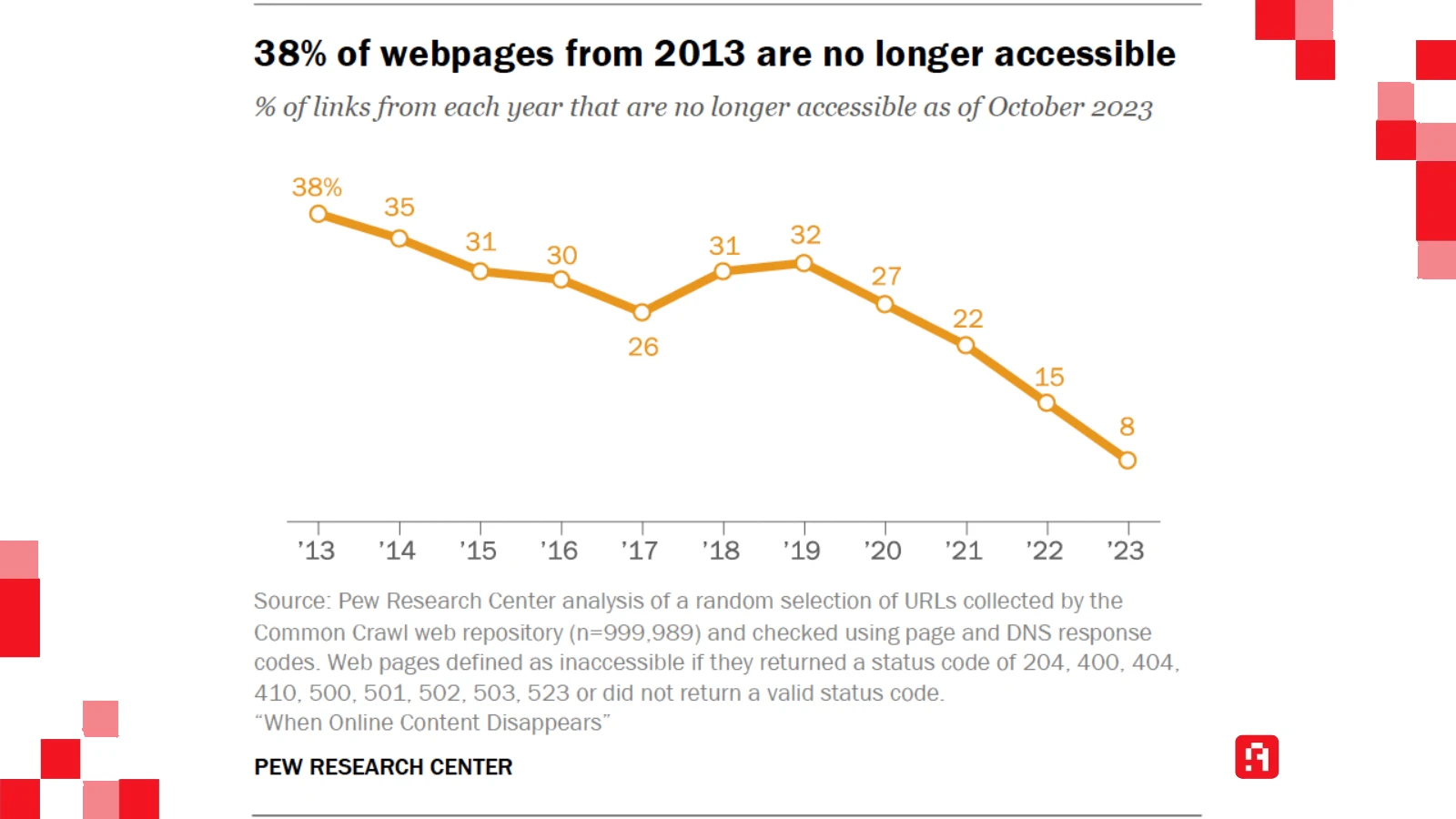 الإنترنت لم يعد ذلك السجل الخالد الذي يحفظ كل شيء، بل أصبح مساحة مضطربة تتلاشى فيها المعلومات بسرعة البرق. نجد أن 25 في المائة من صفحات الويب من 2013 لم تعد متاحة، 23% من الصفحات الإخبارية و21% من المواقع الحكومية تحتوي على روابط معطلة.