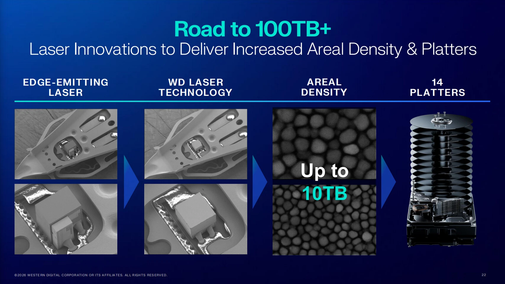 حسنًا، المعلومات التقنية تؤكد أن Western Digital ستعتمد على 14 قرصًا داخليًا وبكثافة تخزين تصل إلى 10TB للقرص الواحد، تؤمن ويسترن ديجيتال أن الأقراص المستندة على تقنية HAMR يمكن أن تصل سعتها إلى 140TB. سيعزز ذلك من كفاءة التكلفة ويحافظ على استمرارية تقنية الأقراص الصلبة في المستقبل البعيد خاصة في مجالات مراكز البيانات والتخزين السحابي.