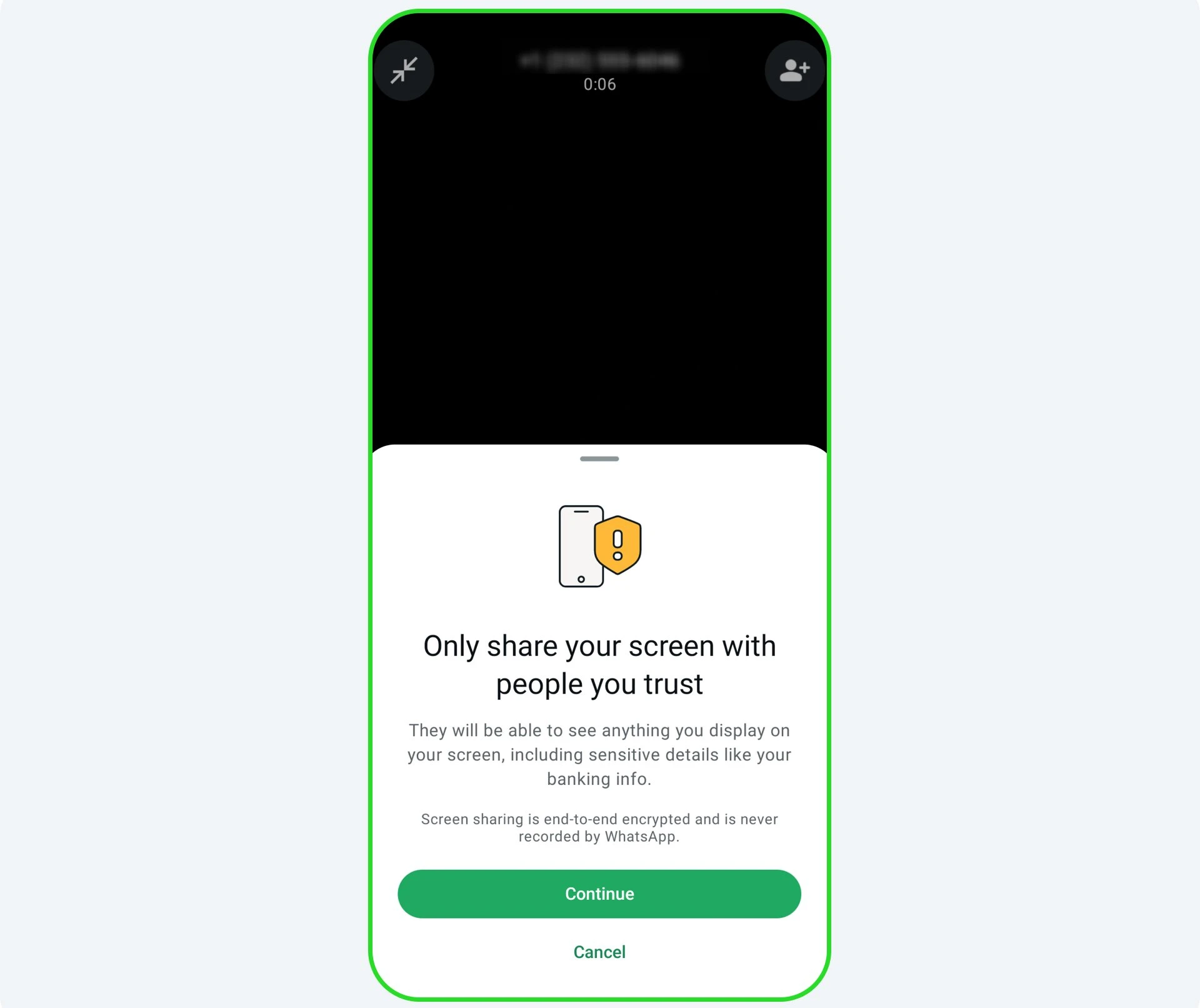 - واتساب يطلق ميزة تحذير مشاركة الشاشة لحماية المستخدمين من الاحتيال.