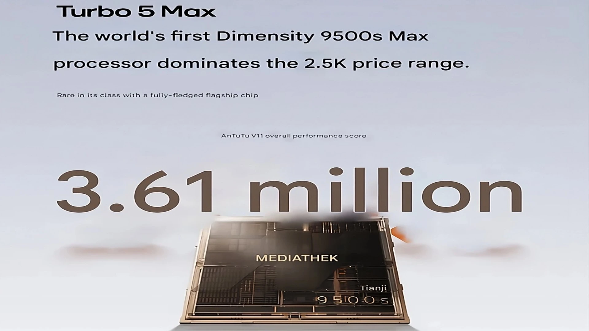 أظهرت حملات شاومي الترويجية أنّ Redmi Turbo 5 Max سيعمل بمعالج MediaTek Dimensity 9500s وسجل الهاتف نتيجة تقريبية تبلغ 3.61 مليون نقطة في اختبار AnTuTu V11 -رقمٌ يقترب من نتائج معالجات الفئة العُليا.