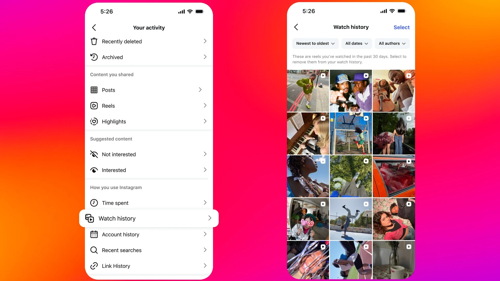 ستجد الميزة داخل ملفك الشخصي، اذهب إلى "الإعدادات" ثم "نشاطك" وستجد خيار «سجل المشاهدة» "Watch History"، وستعرض الواجهة صورًا مصغّرة لجميع الريلز التي شاهدتها خلال آخر 30 يومًا، ويمكنك: