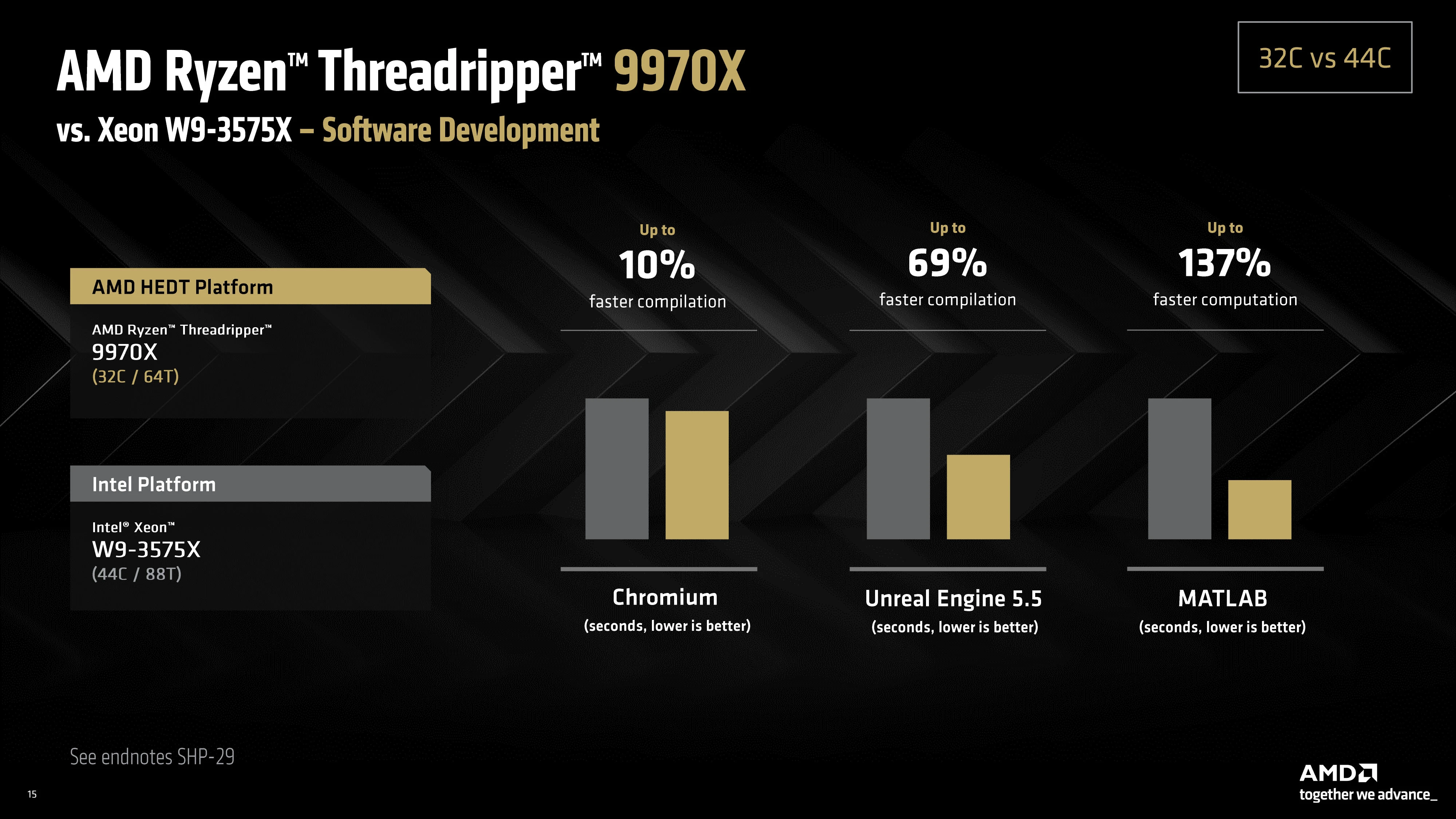 حتى على صعيد اختبارات البرامج المخصصة لإنشاء المحتوى مثل Autodeskk، حقق معالج 9970X أداء أسرع في إنتاج النموذج الرسومي بنسبة تصل إلى 45% مقارنة بمعالج Intel Xeno W9 3575X. بجانب ذلك، نرى أن نتائج الأداء المتعلقة بتطوير البرامج مثل Unreal Engine 5.5 قد حقق فيها المعالج نفسه أداء أسرع بنسبة تصل إلى 69%.