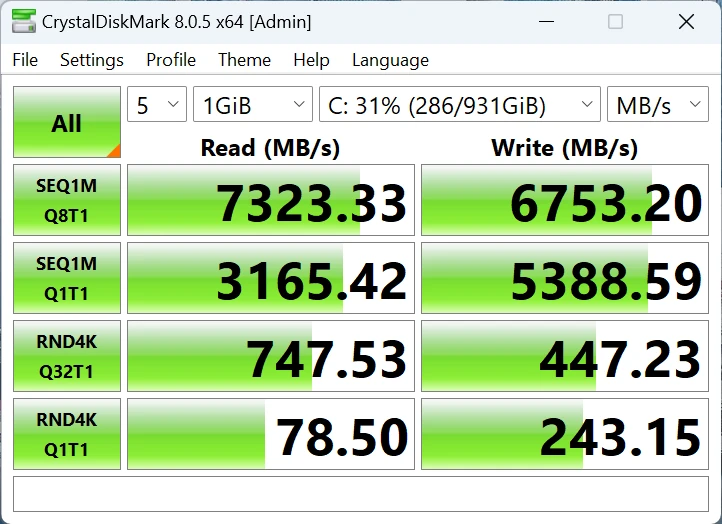 أمّا بالنسبة لوحدة التخزين، فقد حصلنا على نتائج منطقيّة للغاية ومقاربة للسرعات القياسية، مع سرعات قراءة وكتابة مُتسلسلة عند 7323MB/s، و6753MB/s على التوالي. والأمر نفسه ينطبق على الرامات التي كانت تعمل مكسورة السرعة، مع تفعيل ملفّات AMD EXPO.