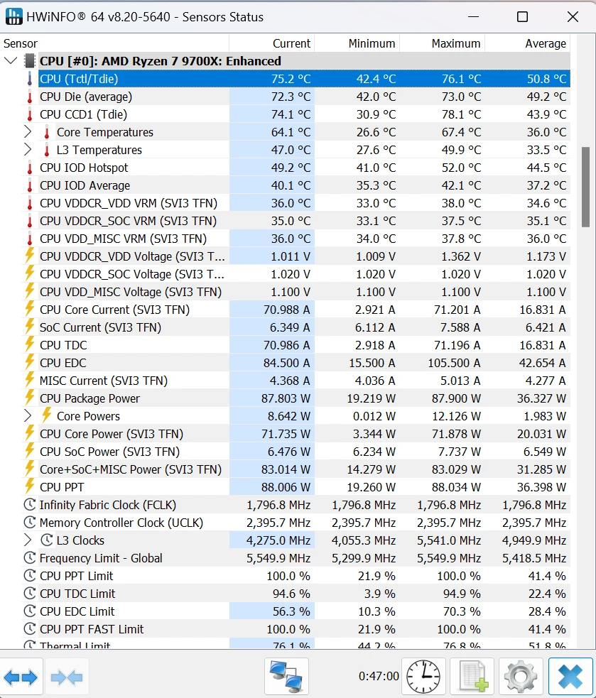 كما نرى من الصورة المُوضّحة أمامنا، استطاع المُعالج أثناء الضغط الوصول إلى تردد تعزيز أقصى 5.55GHz، مع مُتوسّط 5.0GHz للتردد، في حين كانت درجات الحرارة تتراوح بين 51 درجة كمُتوسّط، و 76 درجة كحدٍ أقصى.