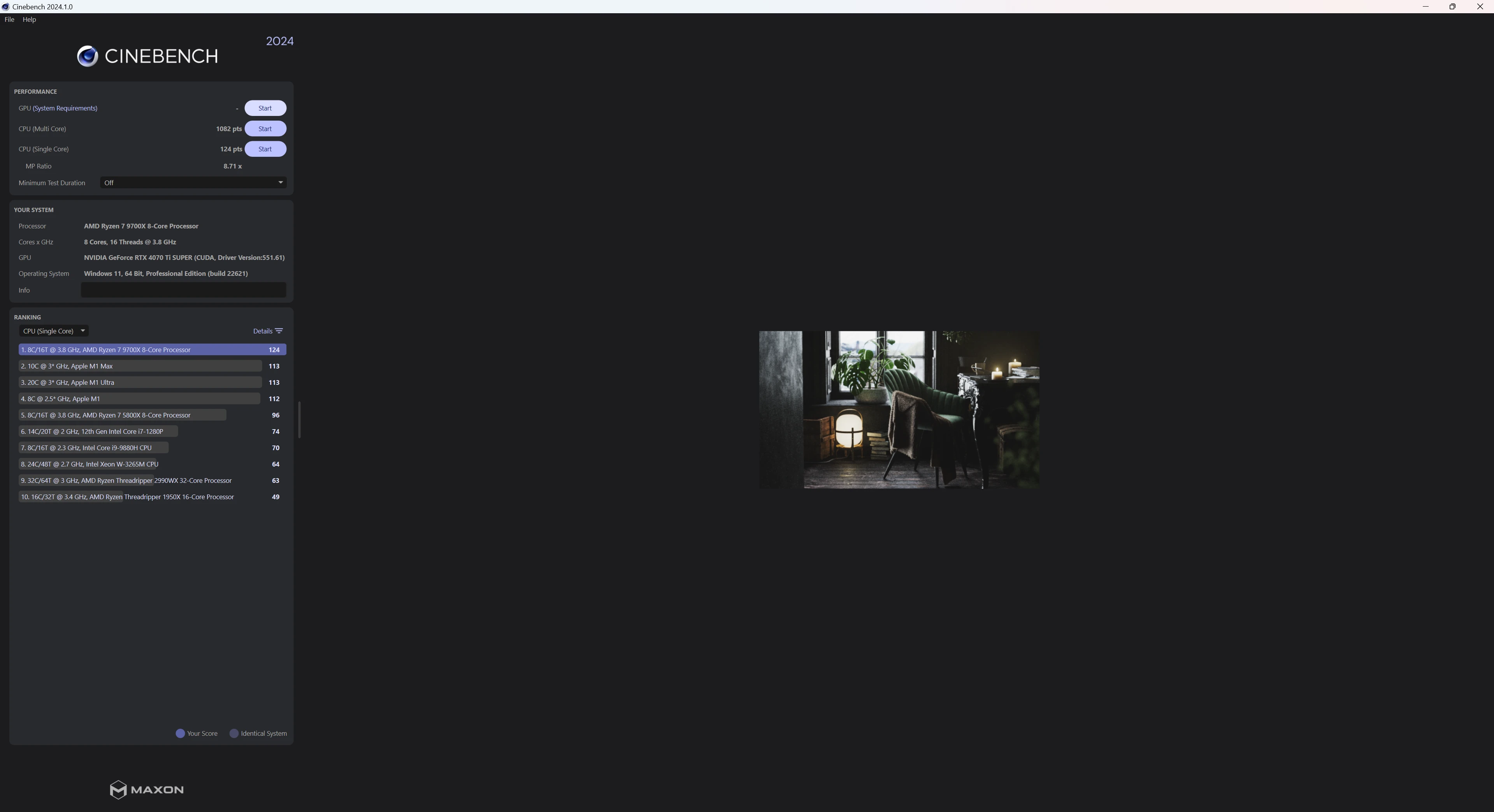 استخدمنا في هذا الاختبار المُعالج المركزي Ryzen 7 9700X ذو الثماني أنوية، الذي يعتبره البعض أحد أفضل المعالجات في الفئة المُتوسّطة من حيث التوازن الذي يُحدثه بين الأداء والسعر. على كل حال، استطعنا الوصول هُنا إلى نتيجة 124 نقطة في أداء النواة الواحدة، وحوالي 1082 نقطة في أداء الأنوية المُتعدّدة. هذه النتائج قريبة جدًا من النتائج التي حصلنا عليها في الأساس مع اللوحة الأم ASUS ROG Crosshair X670E Hero.