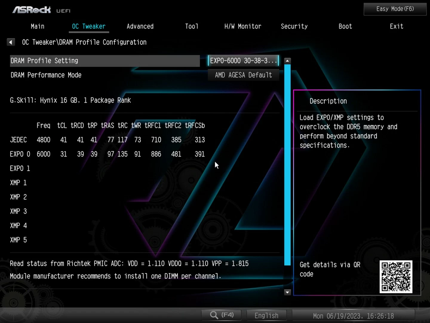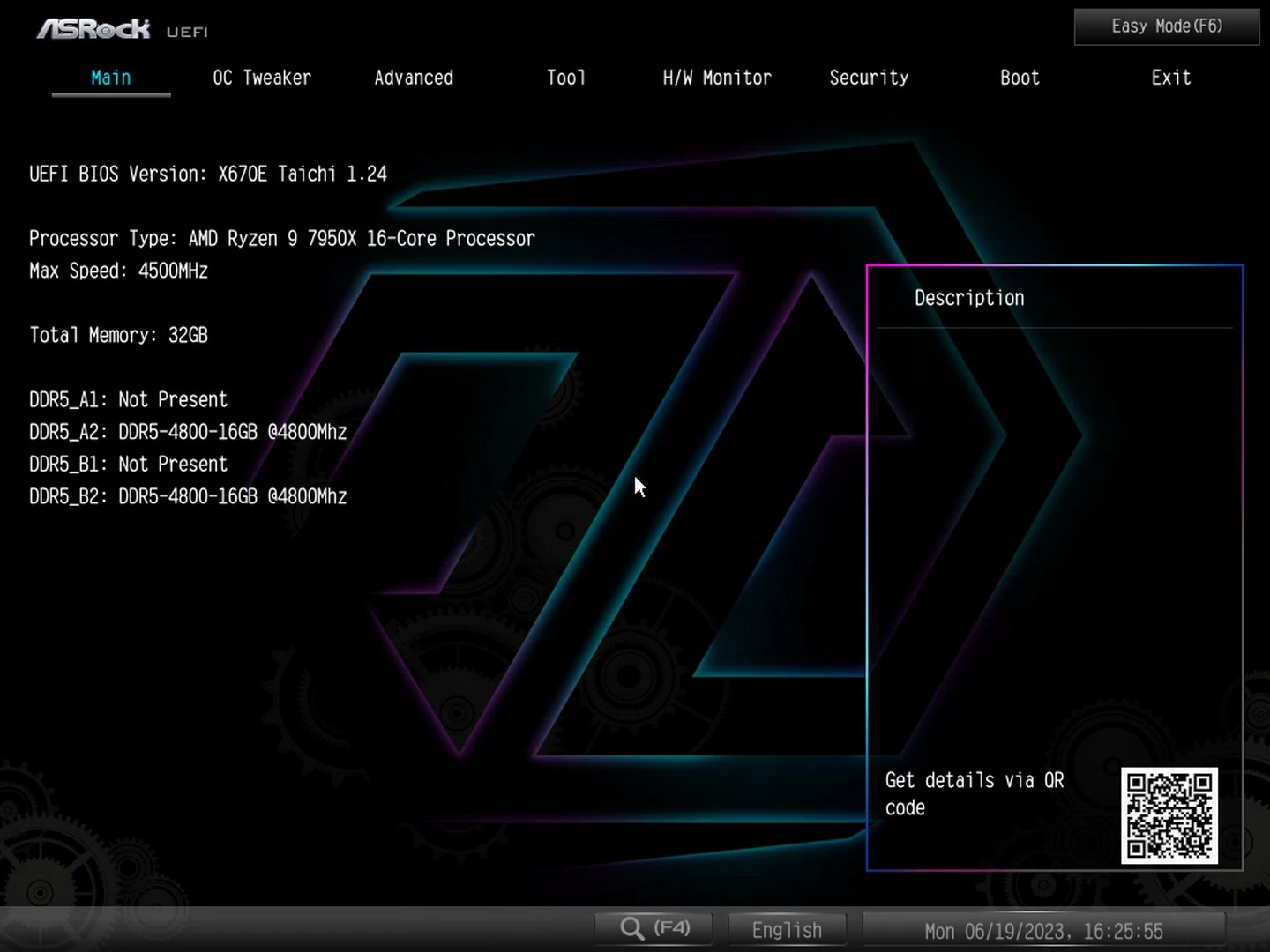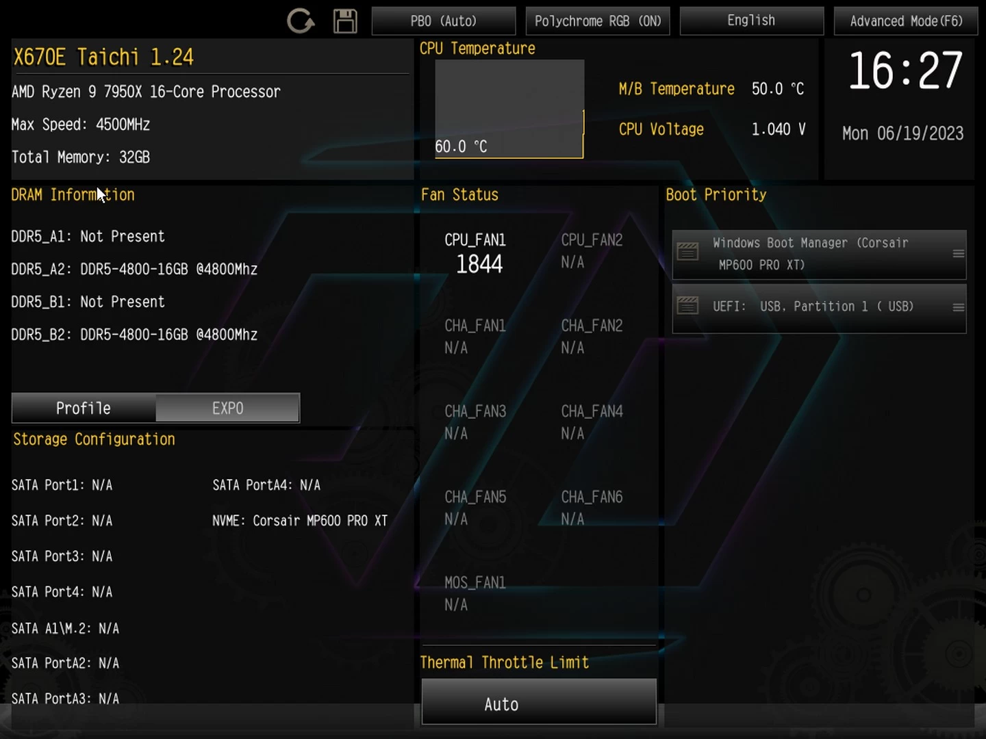 قمنا بعد ذلك بتشغيل الجهاز، ودخلنا للبيوس لنطمئن على ترددات المعالج Ryzen 9 7950X، وقد كان يعمل بالترددات القياسية 4.5Ghz بدون أي مشكلة. الأمر نفسه للرام أيضاً، حيث سنجد أن اللوحة الأم استطاعت الوصول إلي الترددات المُعزّزة بتقنية EXPO بسهولة، لتصل إلى تردد 6000Mhz…