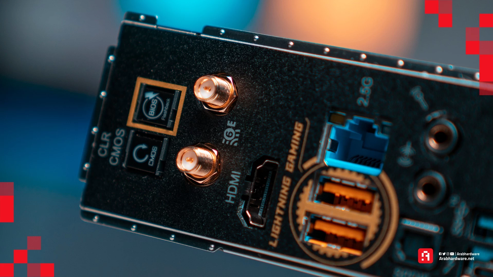 وأخيراً، يوجد أيضًا على اللوحة الخلفية أزرار لإعادة ضبط CMOS واستخدام وظيفة BIOS Flashback.