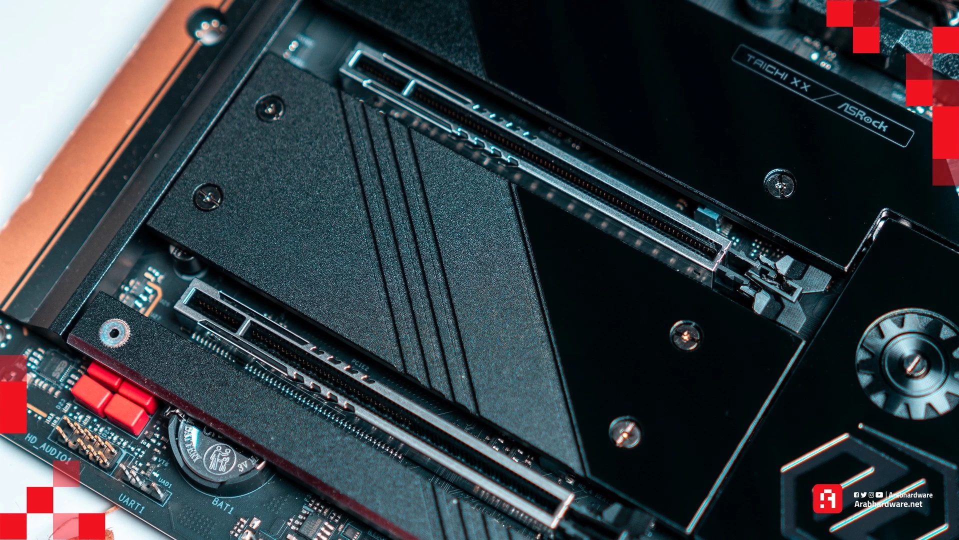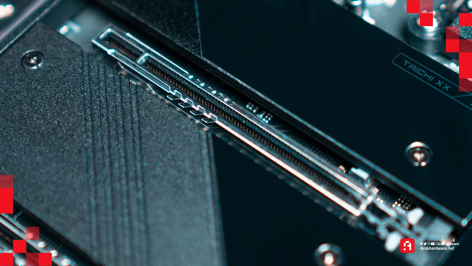 الجدير بالذكر هُنا أن فتحة M.2 المجاورة للرام، يُمكنها تشغيل وحدة تخزين Type-22110 ملم وتعمل في وضع SATA ، بينما تقتصر جميع الفتحات الأخرى على النوع 2280 (80 ملم) وما هو أصغر، وتعمل فقط في وضع PCIe.