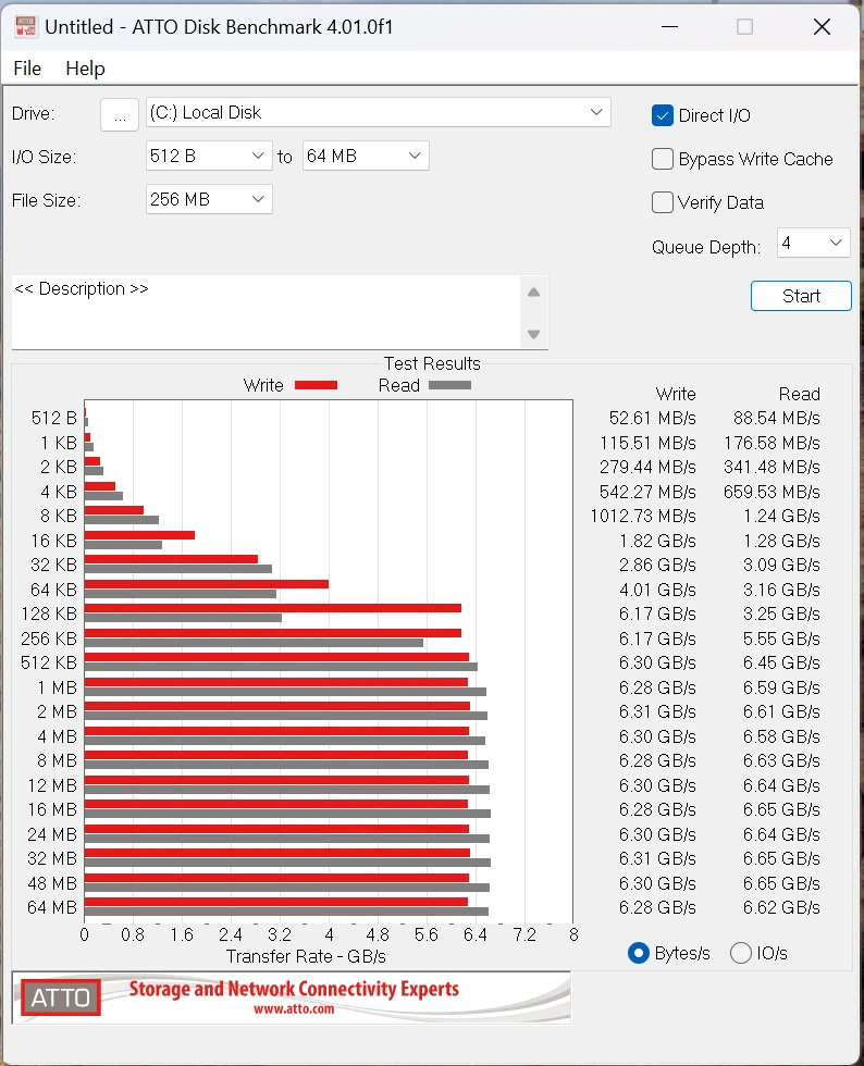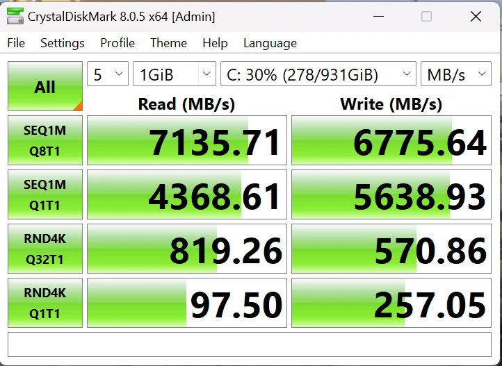 أما بالنسبة لوحدة التخزين فأظهرت نتائج جيدة جدًا، حيث حققت سرعات قراءة وكتابة قريبة بشكل ملحوظ من سرعتها النظرية، مسجلة 7135 و 6775 ميجابايت في الثانية على التوالي.