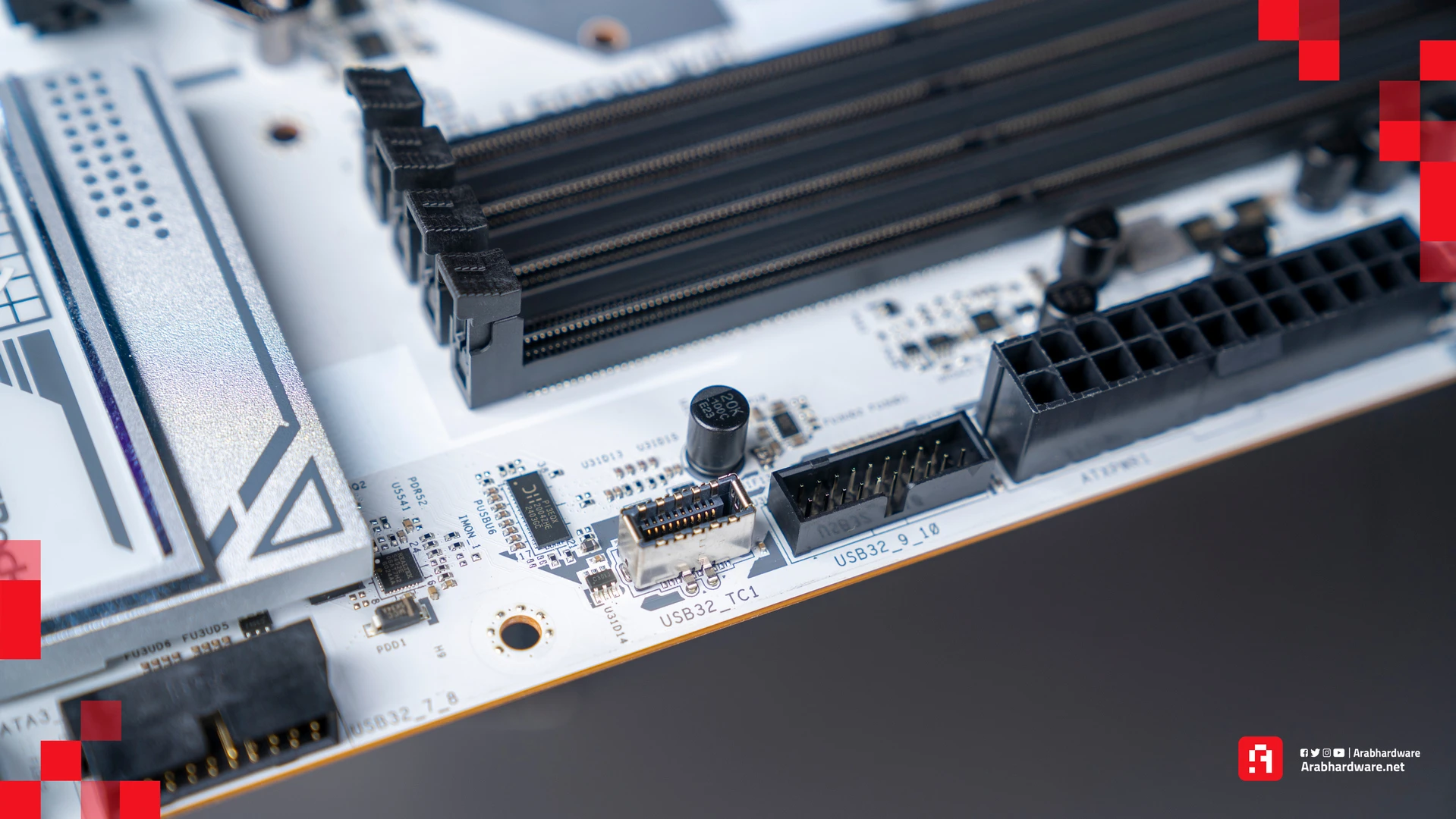 بالنسبة للمنافذ الأمامية، فاللوحة الأم تقدم مجموعة متنوعة وعملية تُسهم في تحسين تجربة الاستخدام ككل. تضم اللوحة -من الأمام- منفذي USB 3.2 Type-C بسرعات تصل إلى 20 جيجابايت في الثانية، أي ضِعف سرعة الجيل الماضي، كما تضم 4 منافذ USB 3.2 Gen1 و4 من نوع USB 2.0.