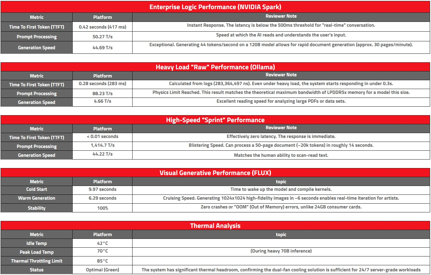 عند استخدام بيئة NVIDIA Spark المحسّنة، سجّل الجهاز سرعة توليد وصلت إلى 44.6 Token في الثانية مع نموذج 120B (هذا الذكاء ذكي بما يكفي للقيام بأعمال تجارية معقدة، تحليلات قانونية، أو أبحاث طبية)، مع زمن استجابة أولي (TTFT) لا يتجاوز 0.42 ثانية، ما يضعه فعليًا في فئة الخوادم المؤسسية من حيث التجربة والاستجابة. هذا الأداء لا يعكس قوة العتاد فقط، بل يبرز بوضوح مدى تأثير التحسين البرمجي على معمارية Grace Blackwell.