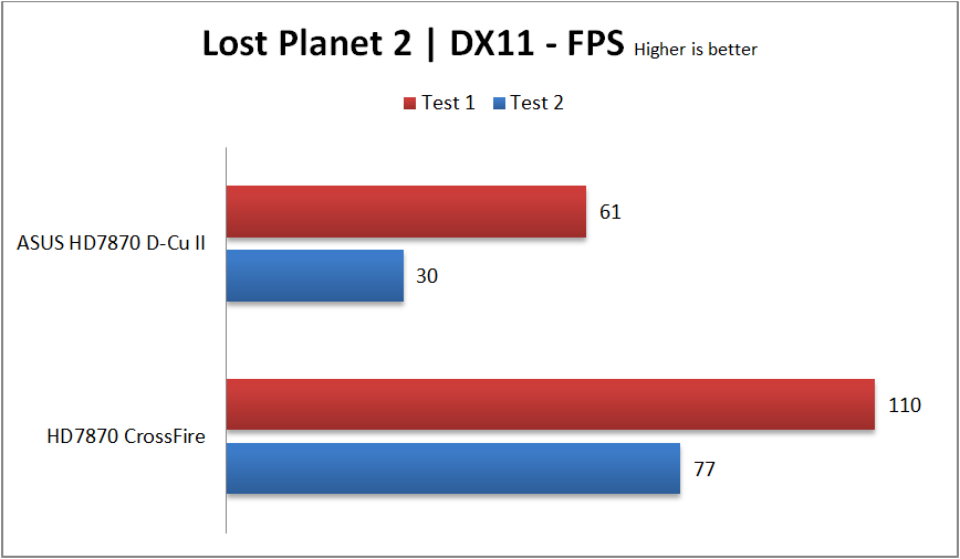 جاءت أرقام برامج الاختبار بـ CrossFire بنتائج تضاعف تقريباً نتيجة البطاقة المفردة, لكن الصور داخل الألعاب لم تتحسن بمقدار الضعف. الأداء تحسن بكل تأكيد, بعض الألعاب تحسن أداؤها بشكل ملحوظ, و أخرى تحسنت بفارق بسيط جداً, مع استثناء Street Fighter التي قل رقمها مع أن الـ FPS ظل يدور حول 60 FPS أي أن الأداء الحقيقي ممتاز.