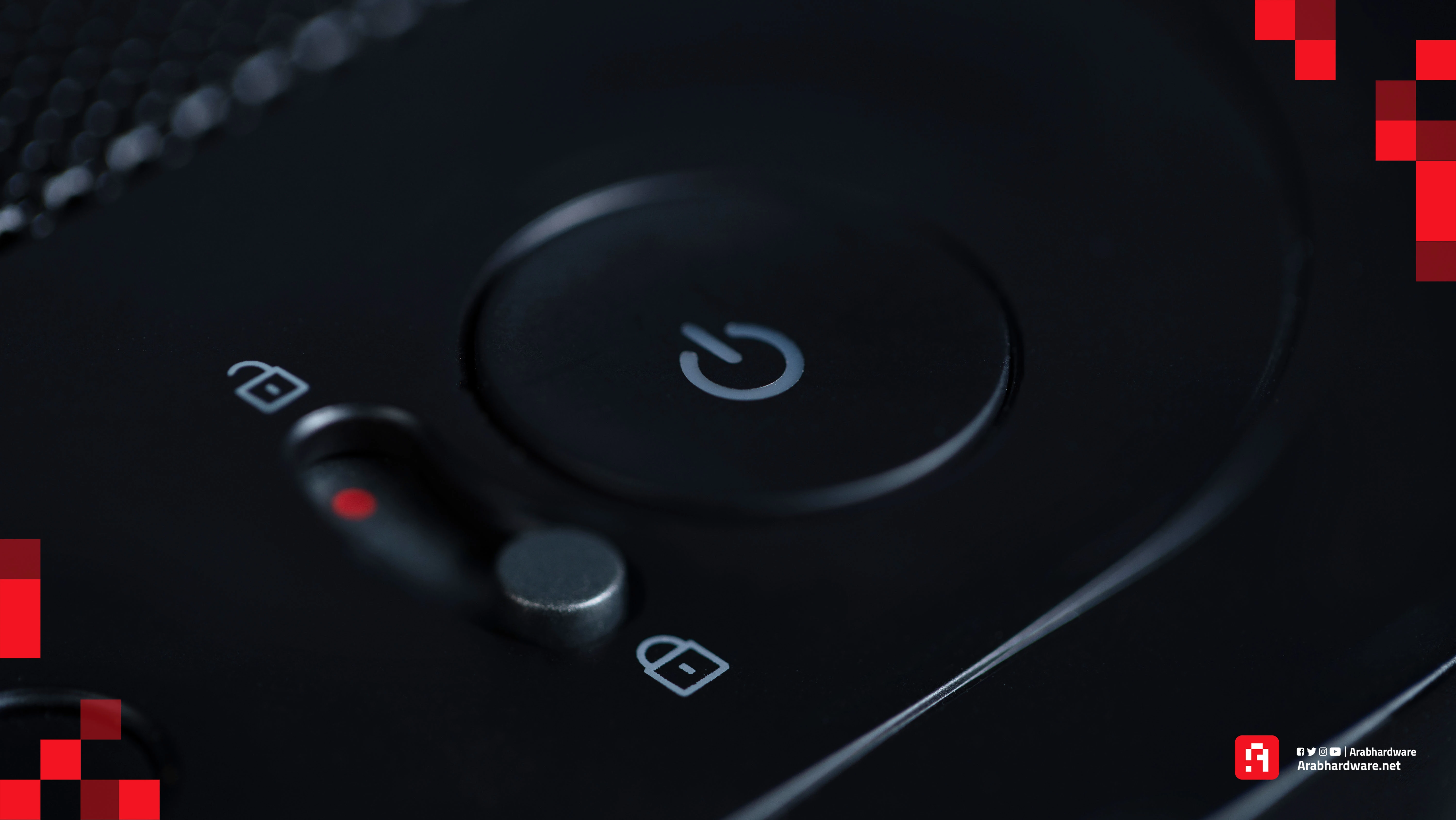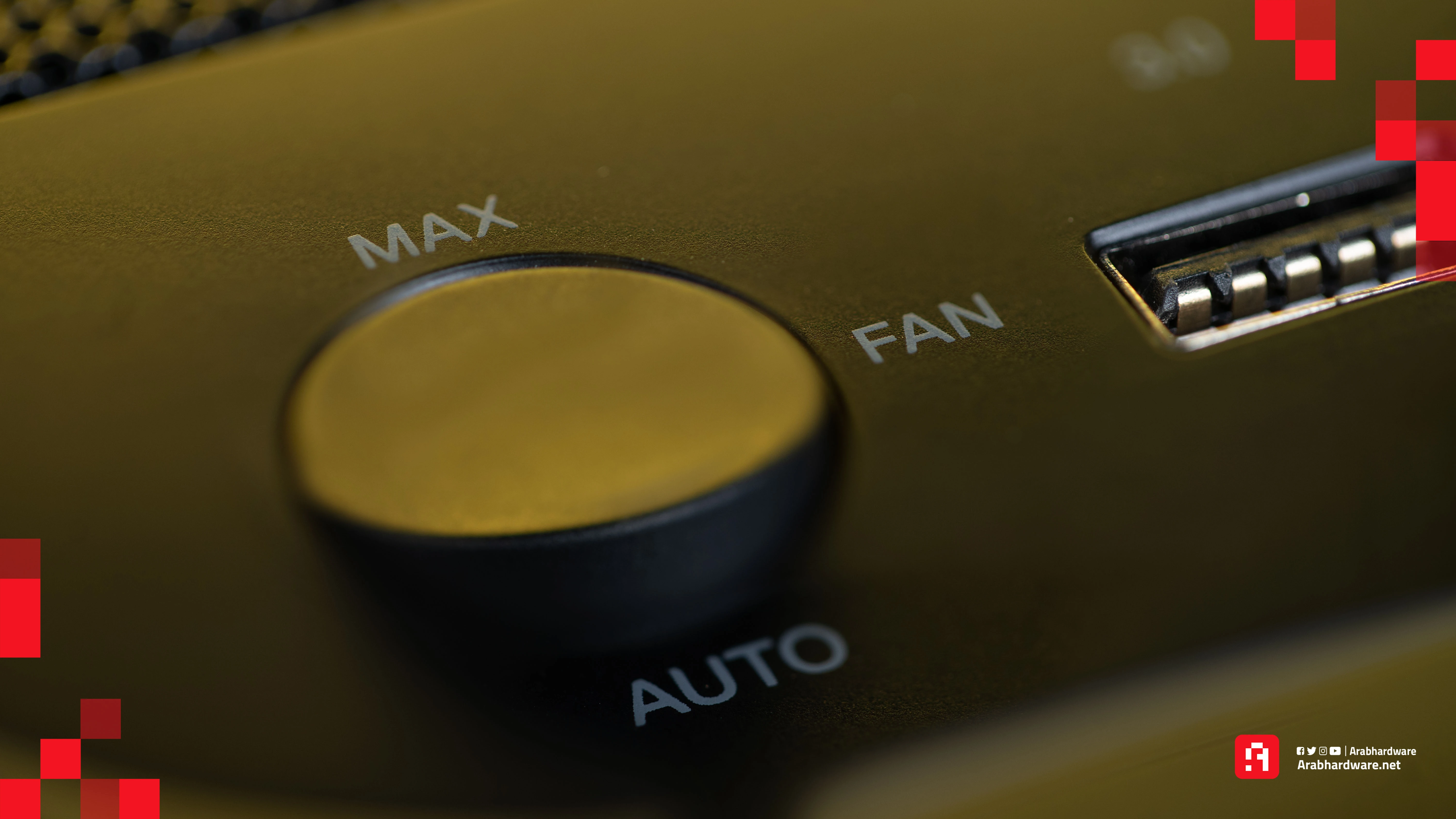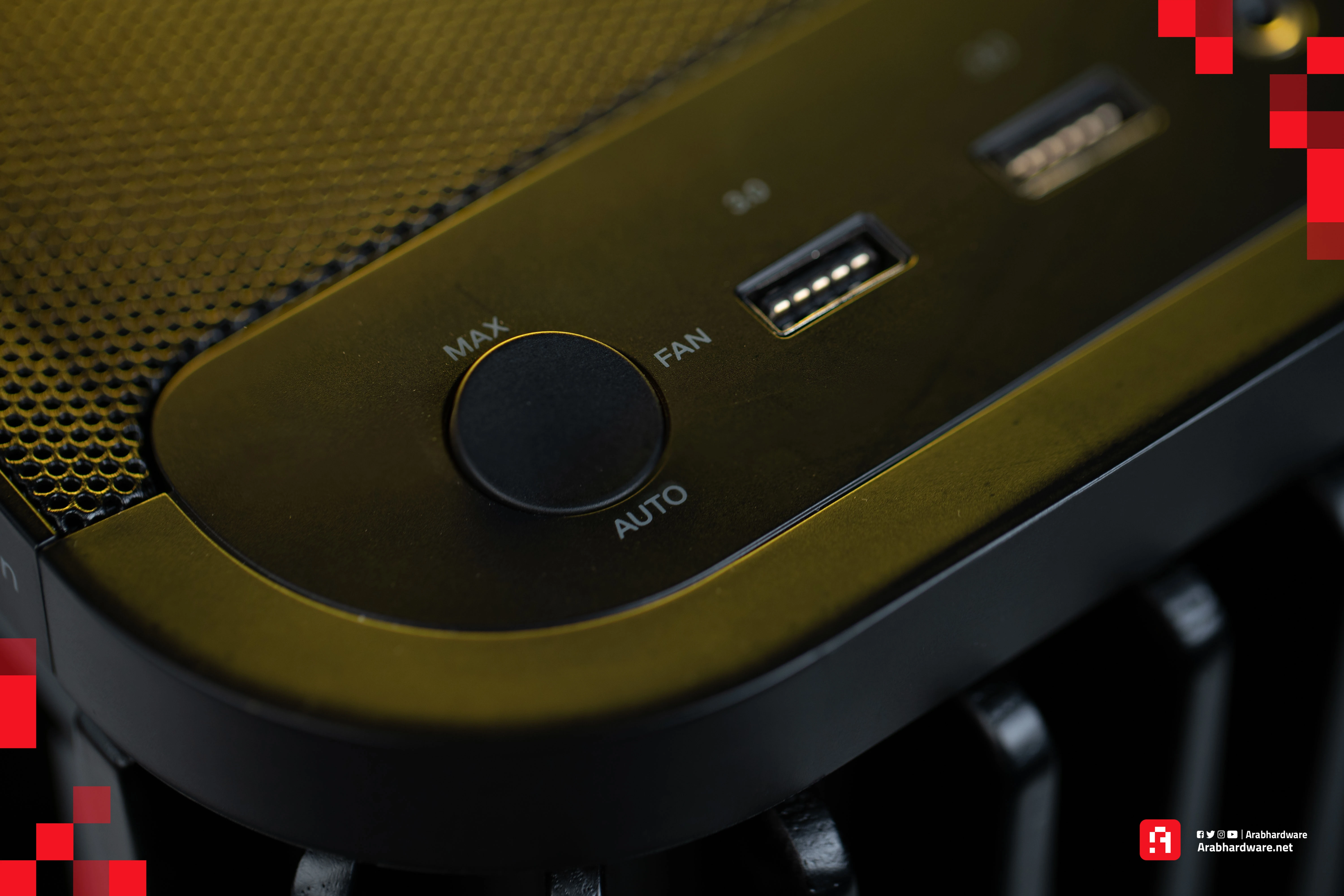 نلاحظ في واجهة الصندوق العلوية احتوائه على زر تشغيل الحاسب، وزر قفل جانبي يمنع الضغط على زر التشغيل نفسه بالخطأ، مع منفذ USB 3.2 Type-C من الجيل الثاني ومنفذي USB 3.2 Type-A من الجيل الأول، مع منفذ صوتي 3.5 مم. وعلى اليسار يوجد زر للتحكم في سرعة المروحة، مما يسمح لك بضبط السرعات يدويًا أو تلقائيًا لأحمال العمل الخفيفة والمكثفة.