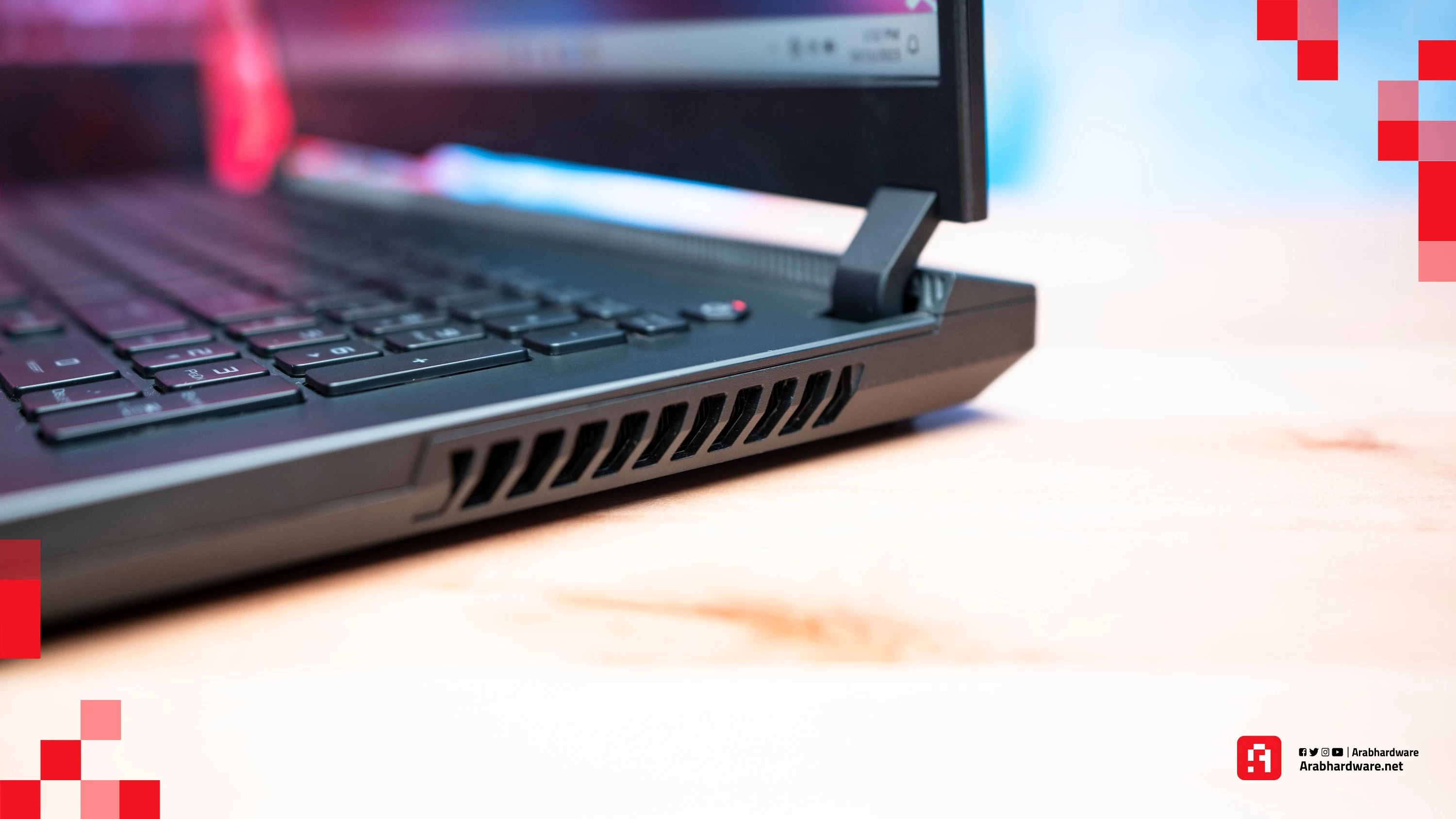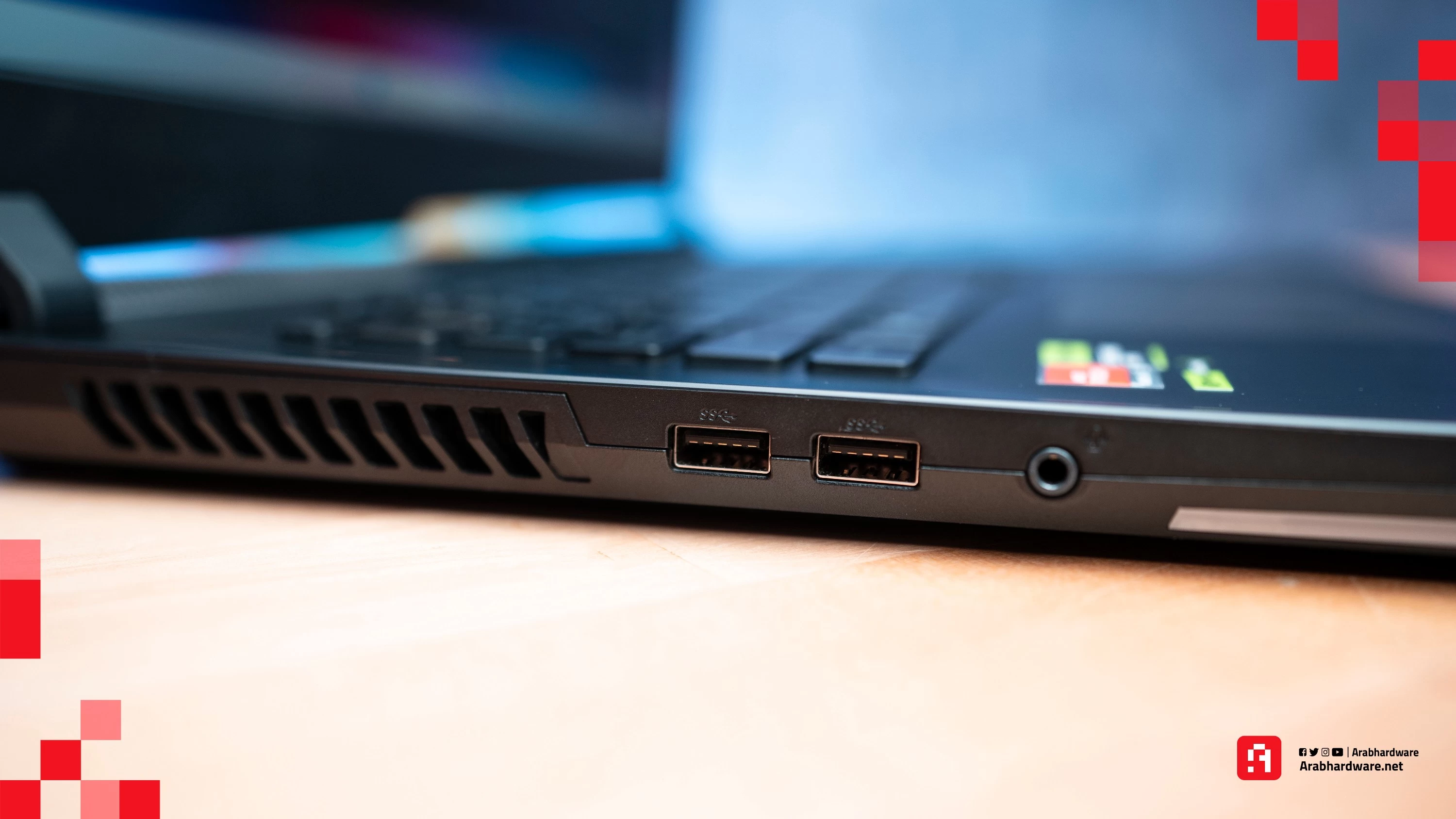 تشغل فتحات التهوية على أغلب المساحة المتاحة في جوانب وخلف اللابتوب. الجهة يمنى بها فتحة تهوية كبيرة تشغل الجزء الأكبر من جانب اللابتوب بينما في الجهة اليسرى تغشل هذه المساحة النصف تقرياً لتترك الماسحة لمنفذين USB 3.2 Gen 1 Type-A وبجانبهم منفذ للميكروفون والسماعات معاً.