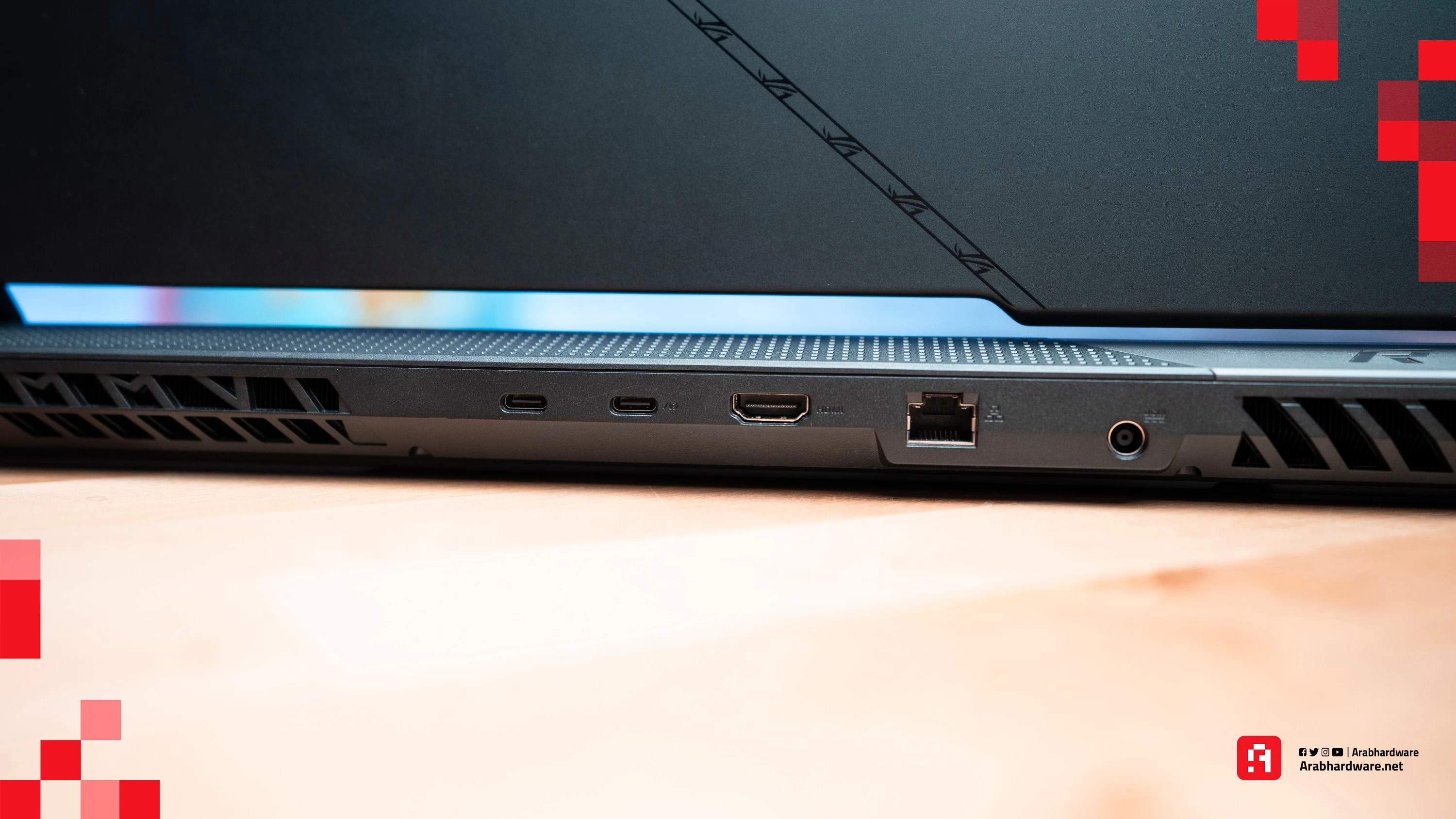 - منفذين USB 3.2 Gen 2 Type-C. كلاهما يمكن استخدامه كـ DisplayPort مع دعم تقنية G-Sync. والمنفذ المجاور لمنفذ HDMI يمكنه شحن اللابتوب لأنه يدعم Power Delivery بقدرة شحن تصل إلى 100 وات.