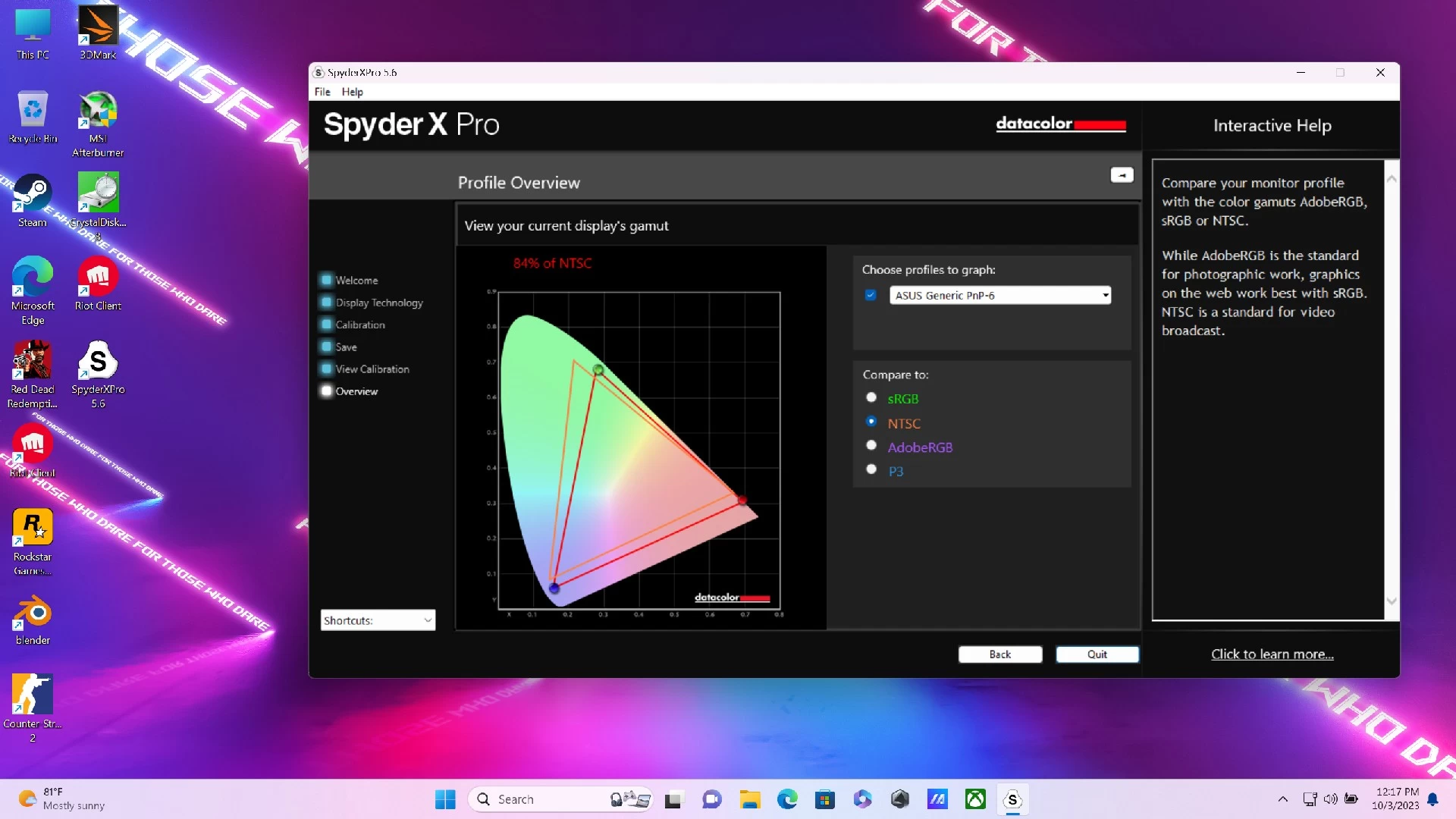 وبعيداً عن أرقام الشاشة التي تظهر تميزها بالنسبة للاعبين دعونا نلق نظرة على أدائها من حيث الألوان والسطوع. شركة ASUS من جانبها تقول أن الشاشة تحقق 100% من معيار DCI-P3 أما اختباراتنا فأظهرت الأرقام التالية: