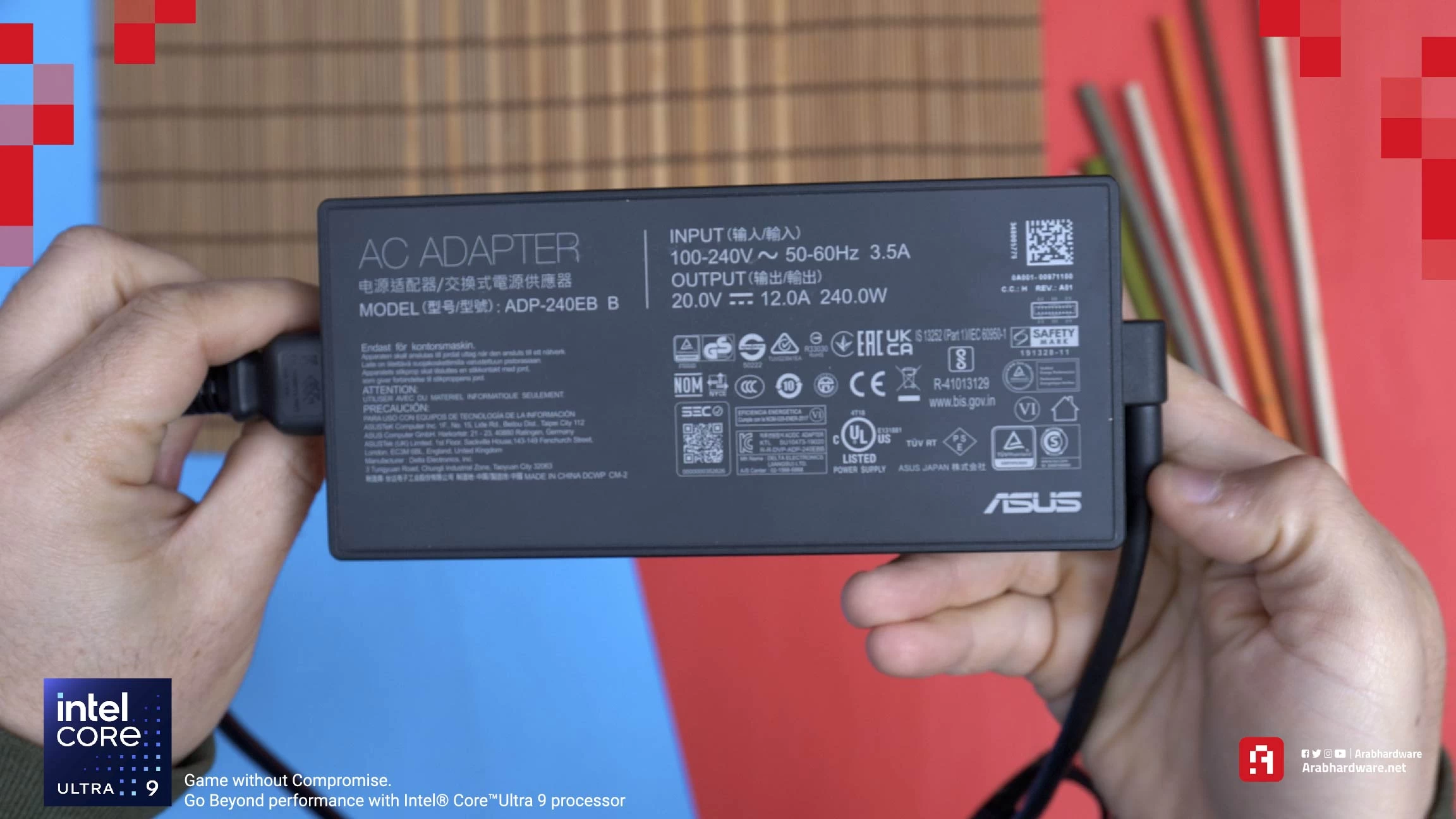 حسناً، لن أطيل الحديث هنا عن البطارية. البطارية تصل سعتها إلى 90Whr، مما يعني أنها مناسبة للغاية بالنسبة للاب توب بهذا الحجم. كما أن الجهاز يأتي مع شاحنين، أحدهما بقدرة 240 واط للعب والاستخدام القاسي؛ في حين أن الآخر يتمتع بقدرة 100 واط، وهو مُخصص بشكل أكبر للاستخدام العادي والعمل البسيط.