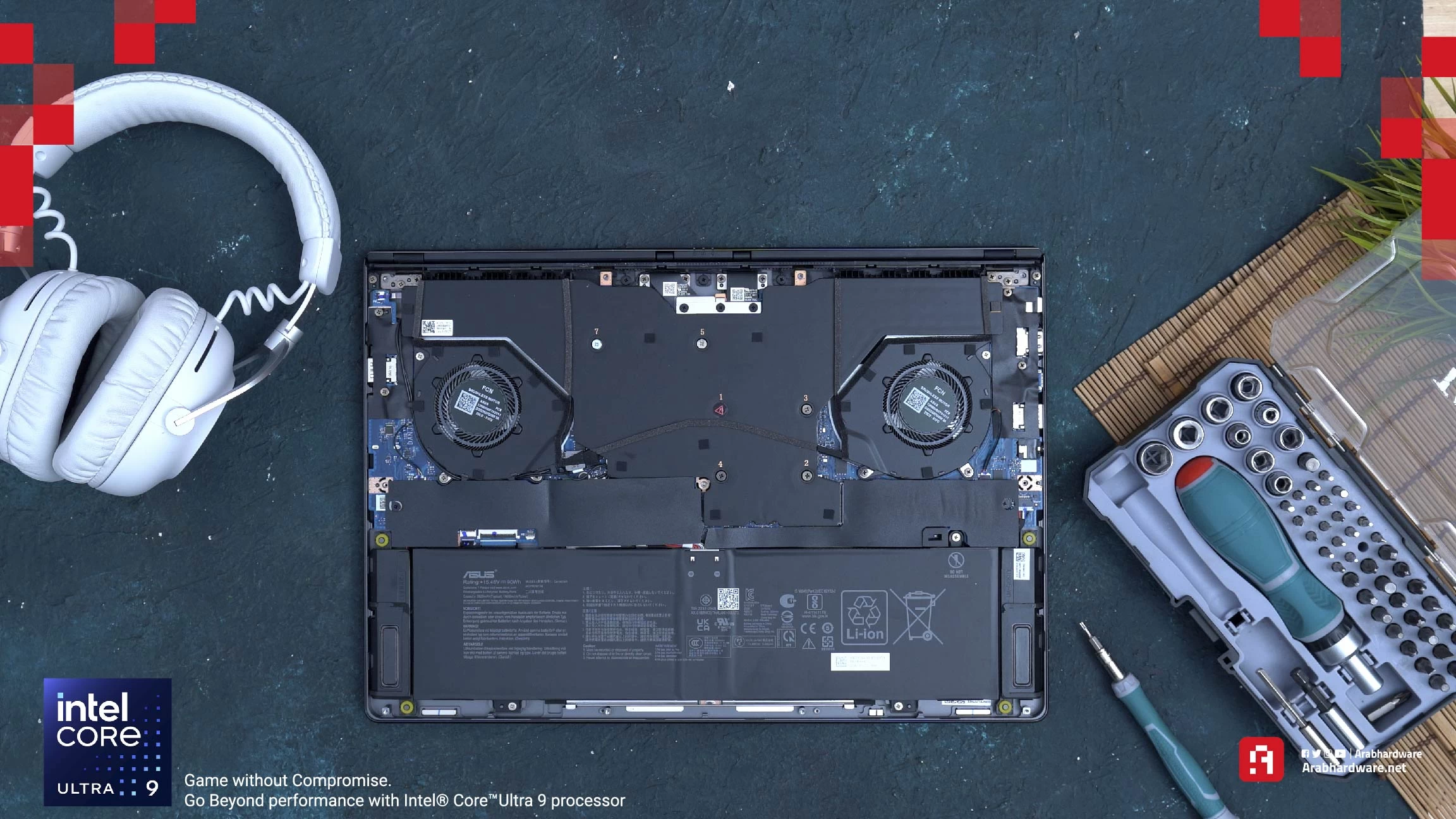 - يستخدم جهاز ASUS الذي معنا المعدن السائل لنقل الحرارة بين المعالج والمشتت الحراري. حيث يستطيع هذا المعدن خفض الحرارة حتى 13 درجة مئوية أقل من المعجون الحراري التقليدي، بسبب قدرته الأعلى على نقل الحرارة.