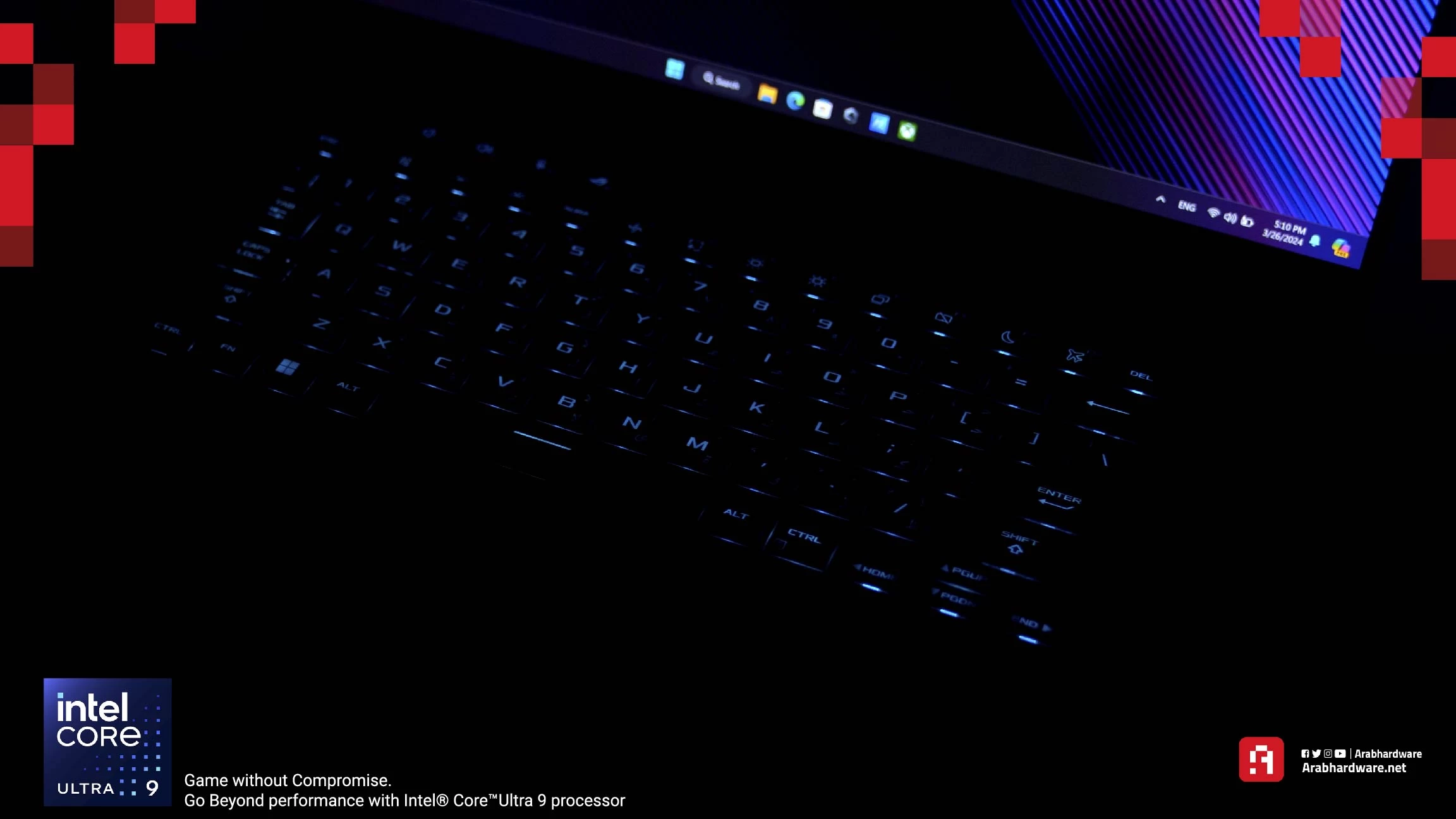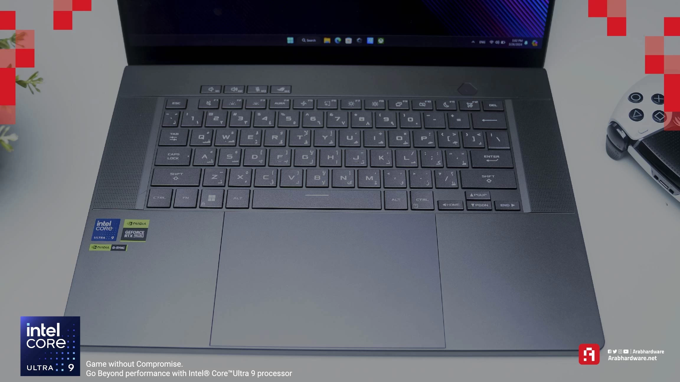 عند فتح اللاب توب نجد أمامنا الكيبورد والسماعة ولوحة اللمس، وبالطبع الشاشة الكبيرة بمقاس الـ 16 بوصة، والتي ستجد أنها نحيفة للغاية. لوحة المفاتيح ليست كاملة للأسف، وتأتي بتصميم 65%، أي أنها تفتقد لوحة الأرقام الجانبية. وأعتقد أن السبب الرئيسي في ذلك هو وجود السمّاعات على جانبي لوحة المفاتيح.