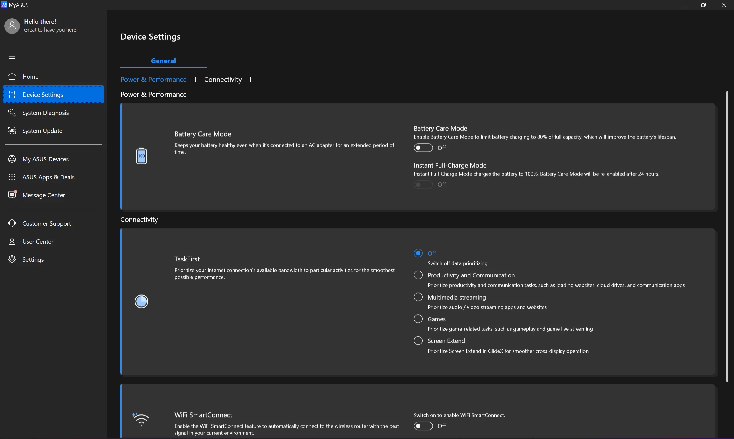 هناك أيضاً الأوضاع المُسبقة التي تقوم بتعديل إعدادات جهازك للتوافق مع المهمة التي ترغب في إنجازها، مثل وضع الألعاب، أو وضع الإنتاجية والتواصل مثلاً. هناك أيضاً وضع WiFi SmartConnect الذي يقوم بتوصيل اللاب توب بأفضل جهاز راوتر لاسلكي في المُحيط للحصول على أفضل إشارة لشبكات الإنترنت اللاسلكي.