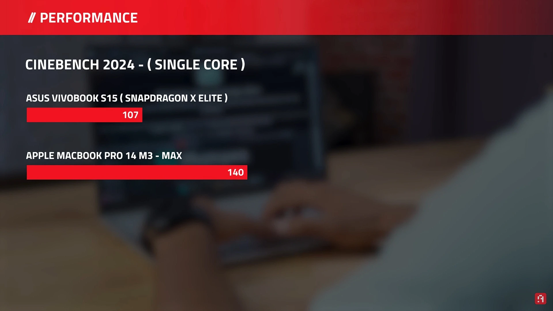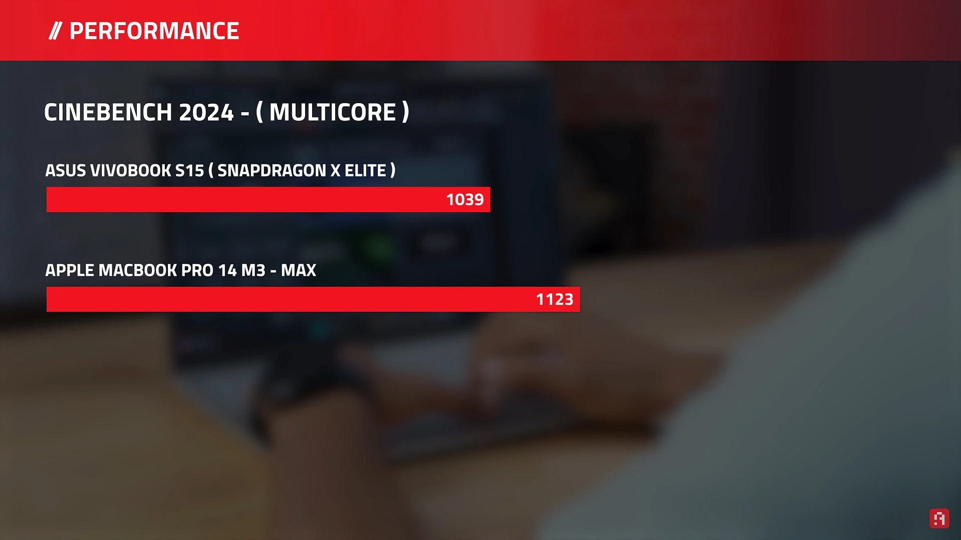 جاء لابتوب Asus VIVOBOOK S15 في المركز الثاني بعد MacBook Pro 14 بمعالج M3 Max في اختبار Cinebench 2024. حقق VIVOBOOK S15 107 نقطة في اختبار النواة الواحدة و 1039 نقطة في اختبار الأنوية المُتعددة. بينما حقق الماك بوك 140 و 1123 على التوالي. في اختبار Geekbench، حقق الفيفو بوك 2392 في اختبار النواة الواحدة على البطارية و2461 عند توصيله بالشاحن. الفارق الوحيد كان في اختبار الأنوية المُتعددة حيث حقق الفيفو بوك 7529 على البطارية و14771 عند توصيله بالشاحن.