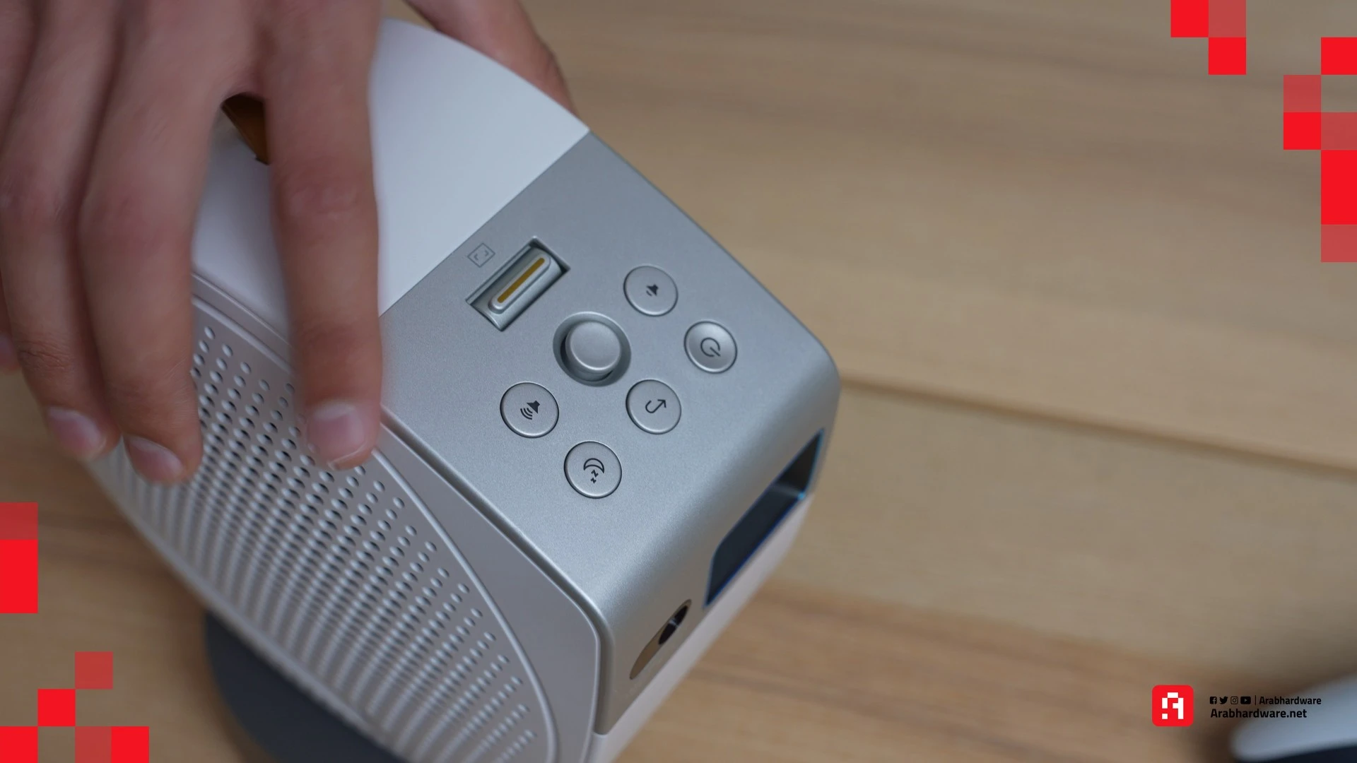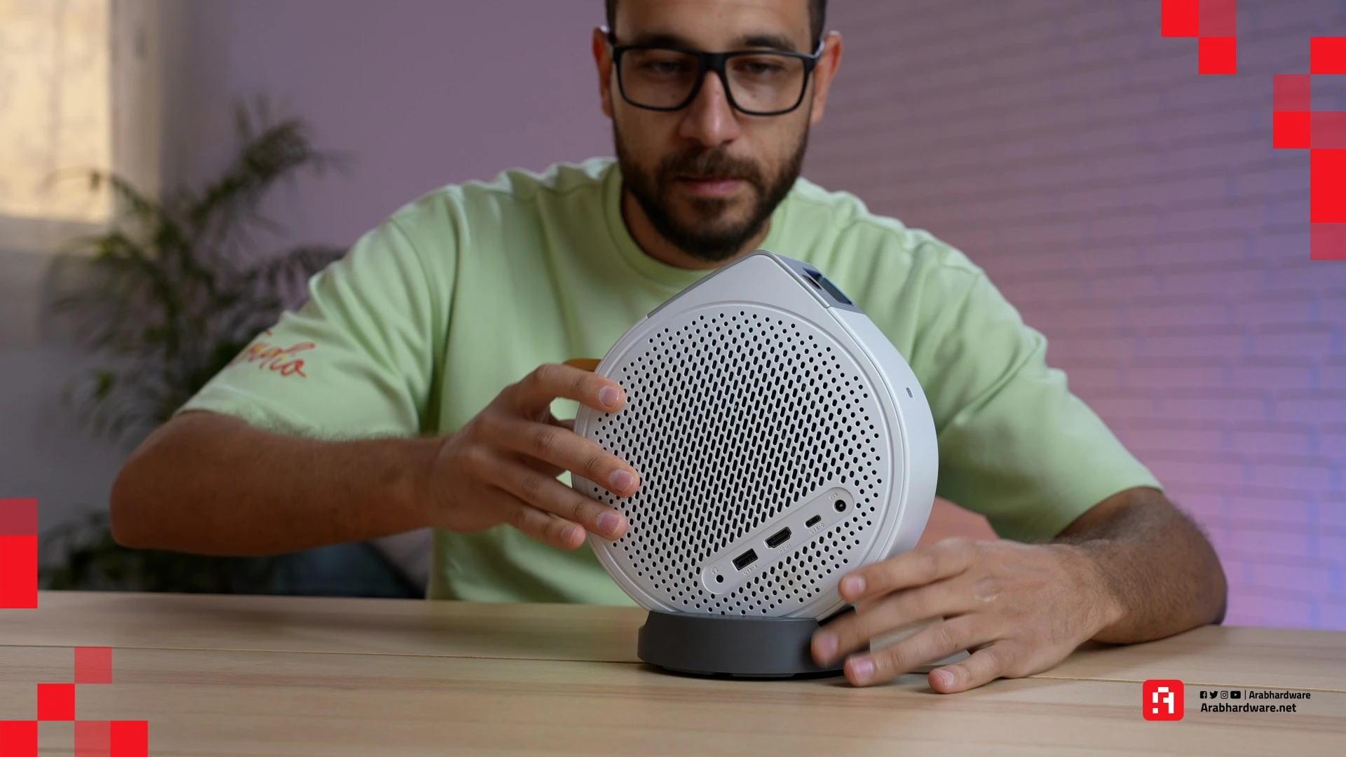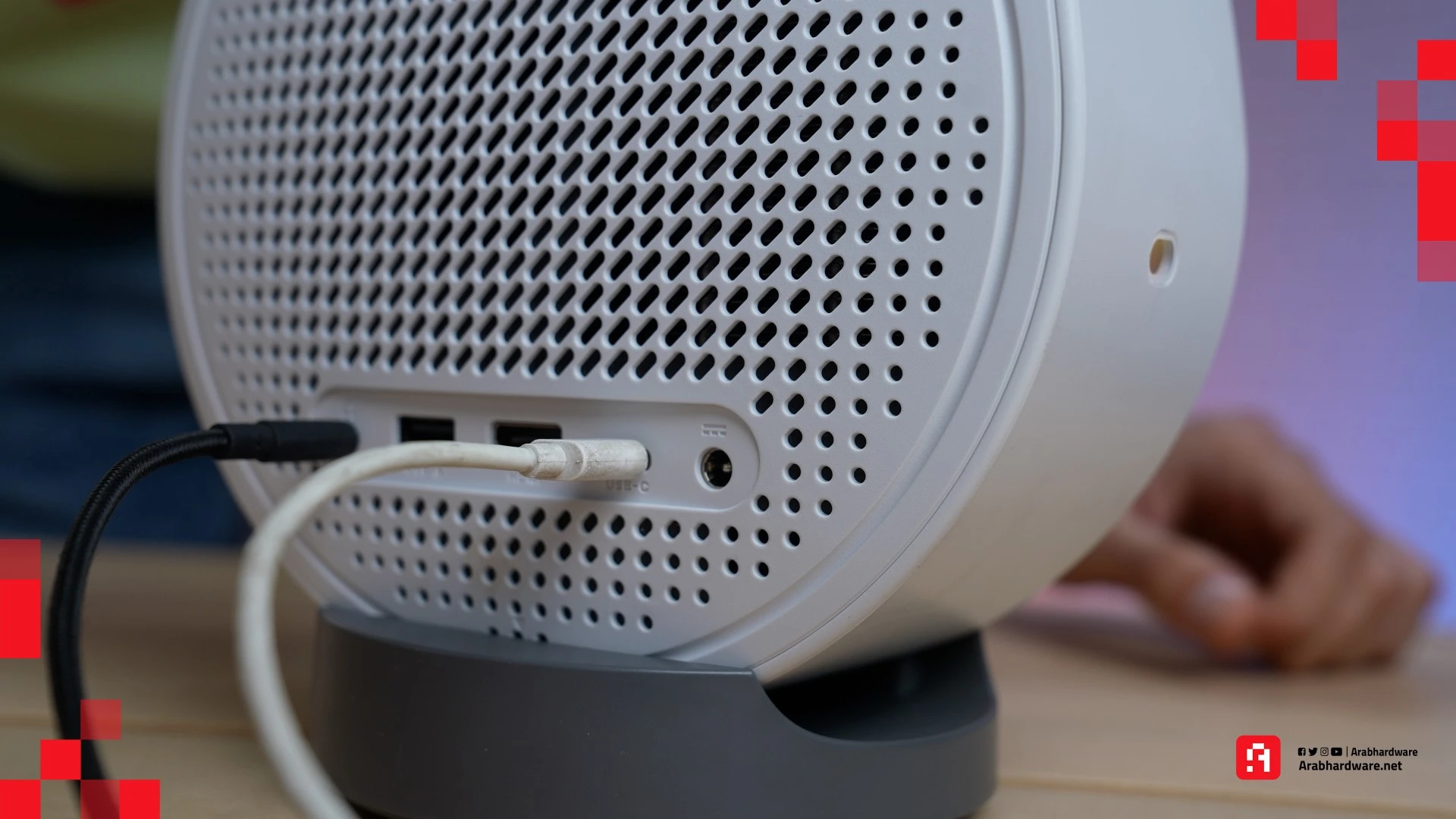 يدعم جهاز العرض مداخل HDMI، وUSB-C، وUSB-A، وهي موجودة على جانب الجهاز. وتكمن المشكلة في أن مكان المنافذ ليس عمليًا بسبب الزوايا المتعددة الذي يمكن لجهاز العرض أن يتحرك من خلالها، لأنها ستقيد الزاوية التي يمكنك من خلالها عرض محتوى من مشغل أقراص DVD، أو جهاز ألعاب، أو أي جهاز آخر يدعم USB-C. وفي حال قلبت جهاز GV50 إلى وضعية أخرى لتتمكن من الوصول بصورة أفضل إلى المنافذ الجانبية، فإن البروجيكتور يقلب تلقائيًا الصورة لتتكيف مع الوضع الجديد، وهذا أمر جيد حقًا.