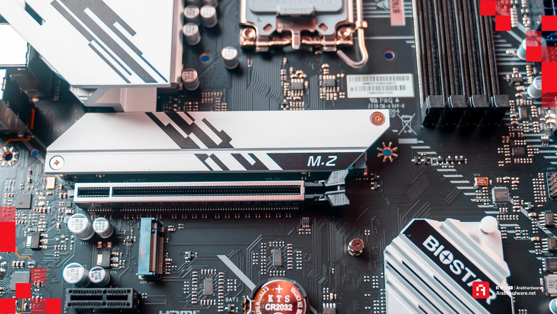 توجد أربع فتحات PCI Express وأربعة مقابس M.2 في منتصف اللوحة. في البداية معنا فتحات PCIe، وهما عبارة عن فتحتان كاملتا الطول، الفتحة العلوية منهما مُعزّزة (الفتحة الأساسية لكروت الشاشة) لتتحمّل كروت الشاشة الثقيلة. تأخذ الفتحة العلوية النطاق الترددي الخاص بها من وحدة المعالجة المركزية وتعمل بسرعات PCIe 5.0 x16.