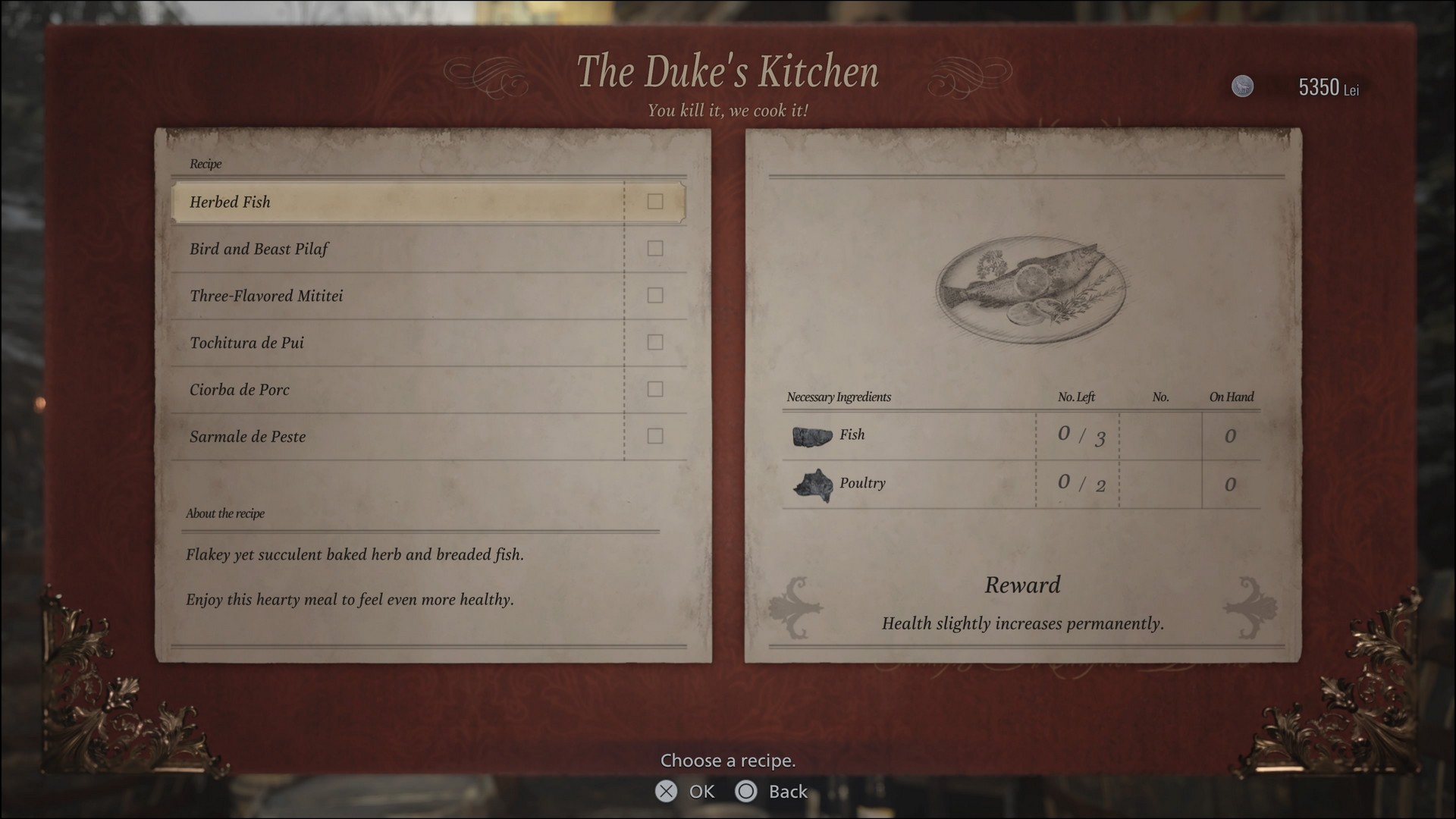 حسناً، لأول مرة يمكنك بالفعل أن تصيد الحيوانات كالدجاج والأسماك لتبيعها للـ Duke لكي يحضر لك Recipe أو خلطة معينة منها من يزيد معدل نقاط حياتك بشكل عام، تقليل الضرر عند عمل Guard، زيادة سرعتك وردات فعلك وغيرها من القدرات الـ Passive التي بكل صراحة لم أجد لها أي فائدة، من الجميل تواجدها ولكنها لم يتم توظيفها بالشكل الذي استدعى ذهابي للـ Duke كل مرة لأجل الإهتمام بها وببساطة لأنني لم أشعر بأن إيثان على مدار طول القصة كان يحتاج لتطوير نقاط حياته، تقريباً لقد أوشكت على إنهائها وكنت ما زلت بمستوى نقاط الحياة العادي الذي بدأت به اللعبة أصلاً ولهذا رضخت لحقيقة أن تلك الـ Recipes غير مهمة. (اسحب لرؤية الصور)