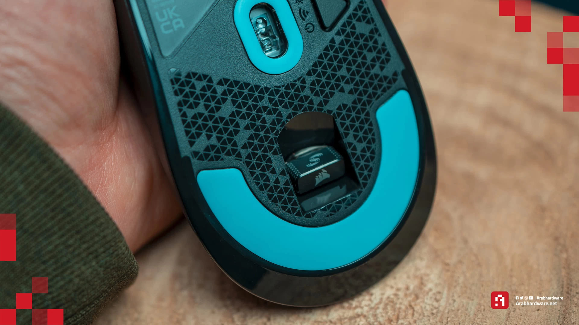 في الناحية السفلية من الماوس، توجد أمامنا مجموعة من الأمور. في البداية لدينا حجرة تخزين للدونجل في الجانب السفلي من الماوس، ولكنها مكشوفة للأسف دون غطاء، مما قد يسبب تراكم الأتربة مع مرور الوقت. هناك أيضاً الأرجل من نوع PTFE (من مادة Teflon) الناعمة غير المصبوغة مع حواف مستديرة قليلاً، وسمك متوسط، مما يساعد في حركة الماوس على الأسطح المختلفة، ويوفر قدرة كبيرة على الانزلاق.