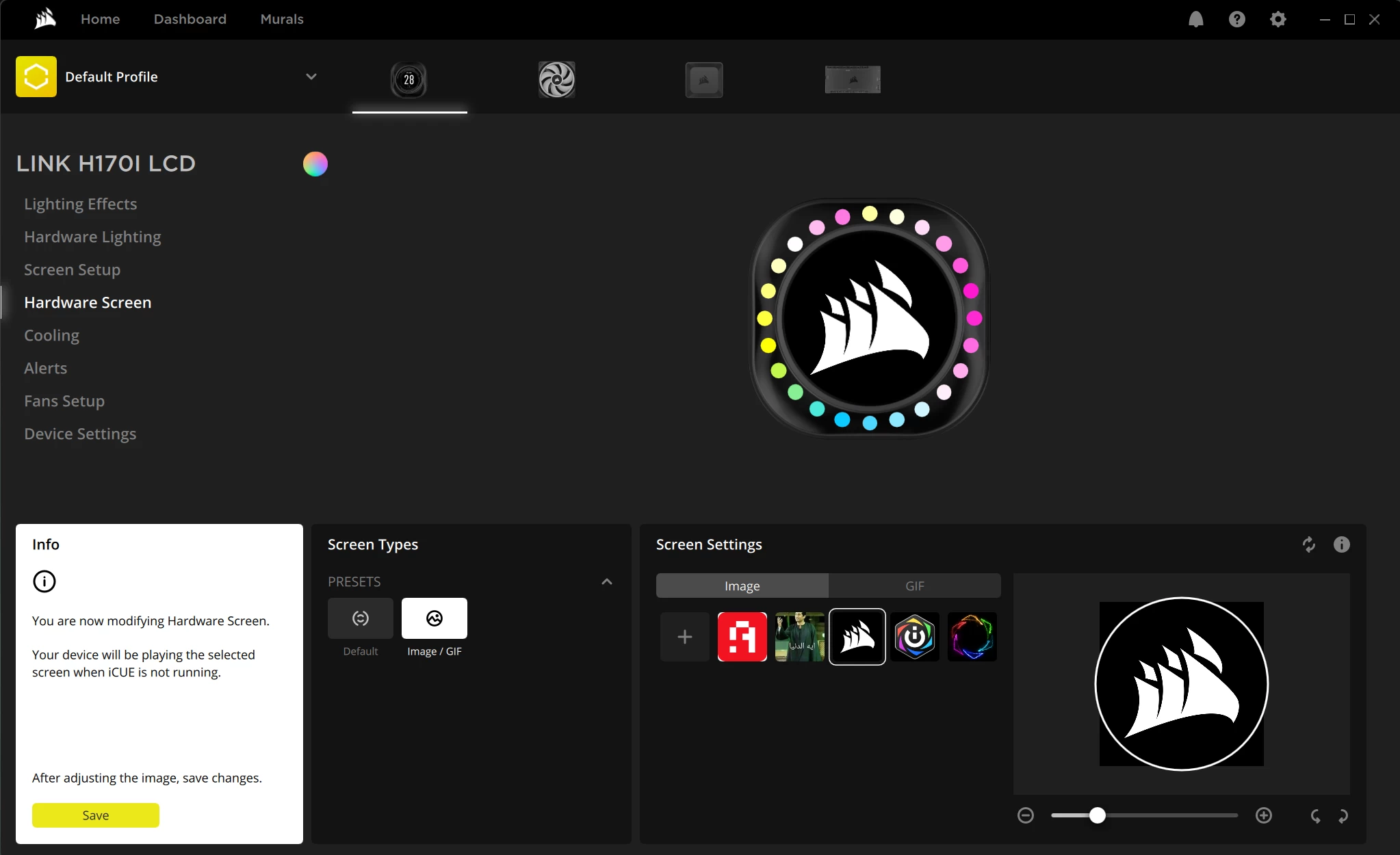 وكما هو الحال في الإصدارات السابقة من iCUE، يتم حفظ تغييرات الإعدادات إما في ملف تعريف البرنامج أو الجهاز، اعتمادًا على الخيار الذي تم اختياره.