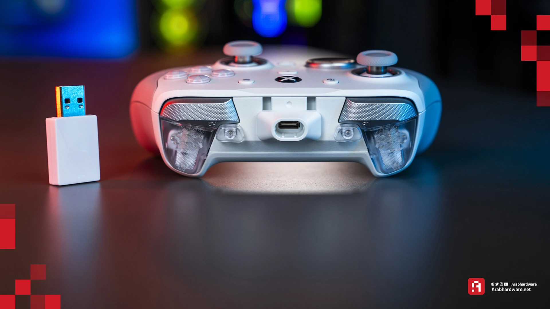 كما لدينا زر من الجهة الخلفية يتيح لك توصيل وحدة التحكم باتصال البلوتوث أو بالدونجل المتوفر معه. وفي حال كنت تريد تشغيل وحدة التحكم أو إغلاقها سيكون ذلك من خلال زر Xbox الموجود في وسط الجهاز، كما سيسمح لك هذا الزر بالانتقال إلى مكتبة الألعاب التي لديك عند الضغط عليه أيضًا (في حال استخدمت وحدة التحكّم مع الحاسب).