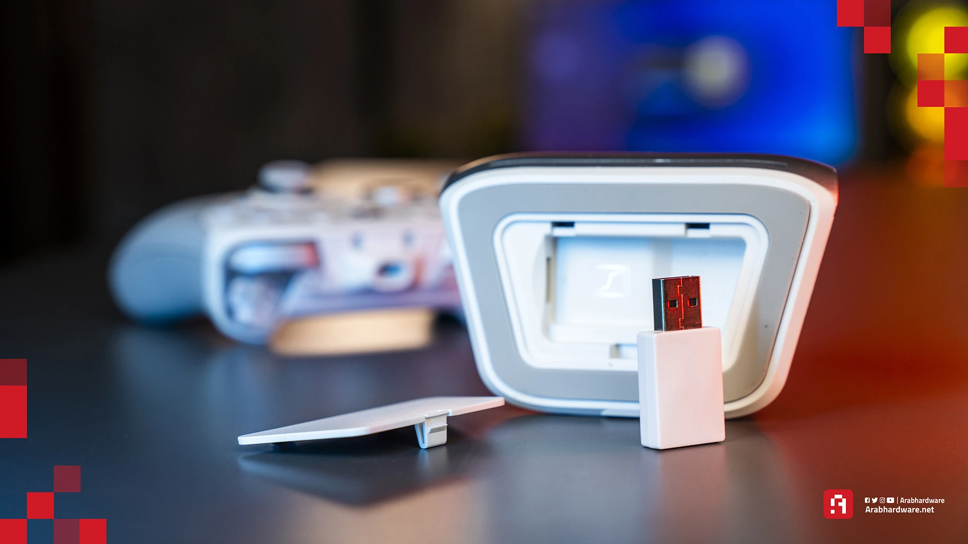 التوصيل كان سهل للغاية، فهو يجمع بين ثلاثة خيارات: التوصيل السلكي من خلال كابل USB Type-C، والتوصيل اللاسلكي، والتوصيل من خلال البلوتوث. كذلك تأتي مع وحدة التحكم قطعة الشحن التي يمكن وضع يد التحكم عليها لتشحنها، حيث يمكن توصيل الدونجل بقاعدة الشحن من الجهة الخلفية وبذلك يمكنك اللعب والشحن في الوقت نفسه.