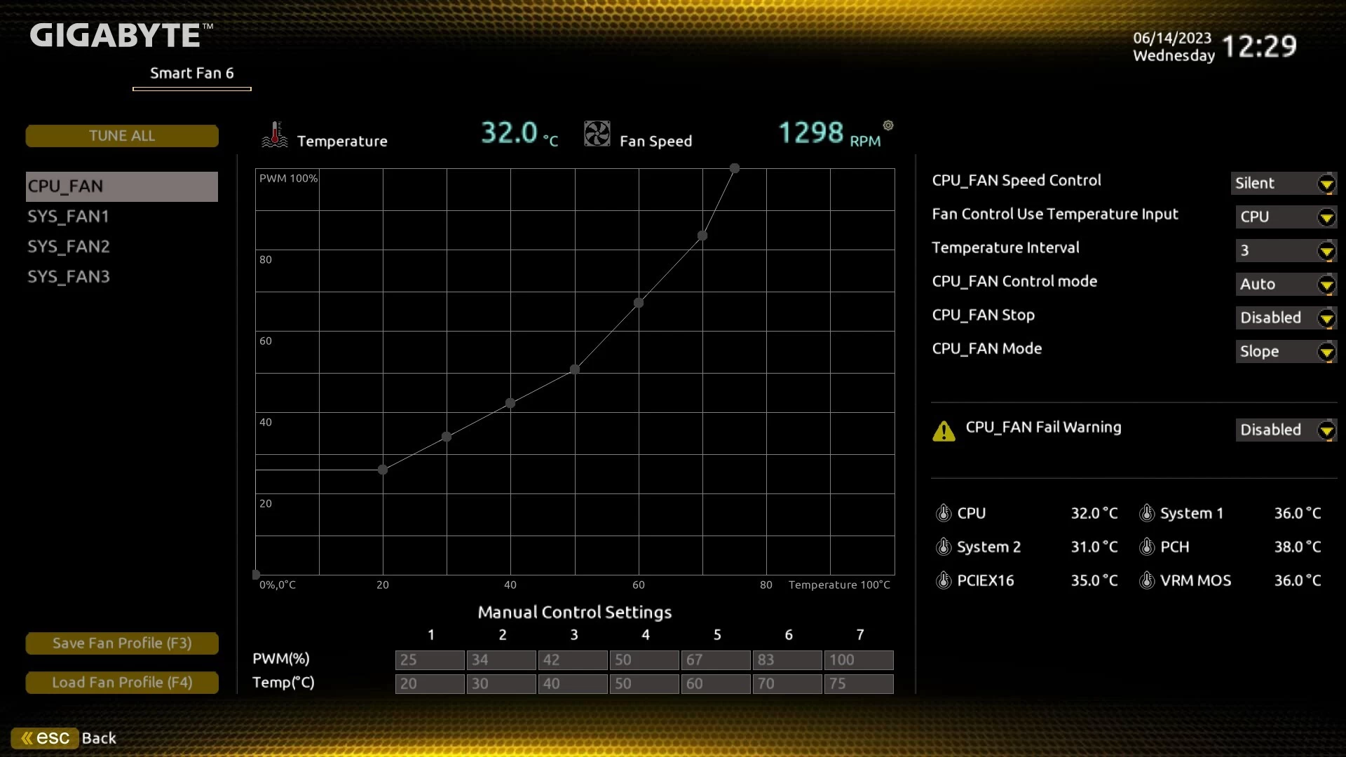 وكما يحدث في كُل مرّة، فقد قمنا في البداية بفحص درجات الحرارة والترددات عند الوضع الطبيعي والقياسي للمراوح. وقد كانت النتيجة جيدة للغاية مع درجات حرارة قياسية في حدود الـ32 درجة للمعالج (Core i5 12400). في حين كانت درجة حرارة النظام حول الـ31 درجة مئوية، ودرجات حرارة باقي المكونات الأساسية على اللوحة الأم كانت في نفس هذا النطاق.