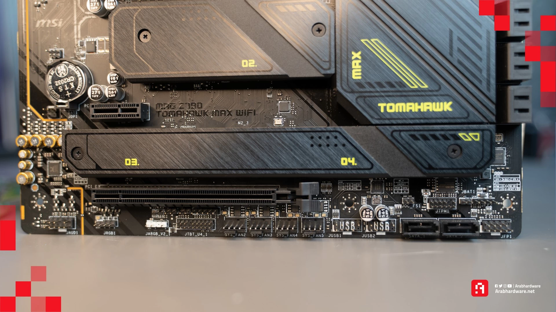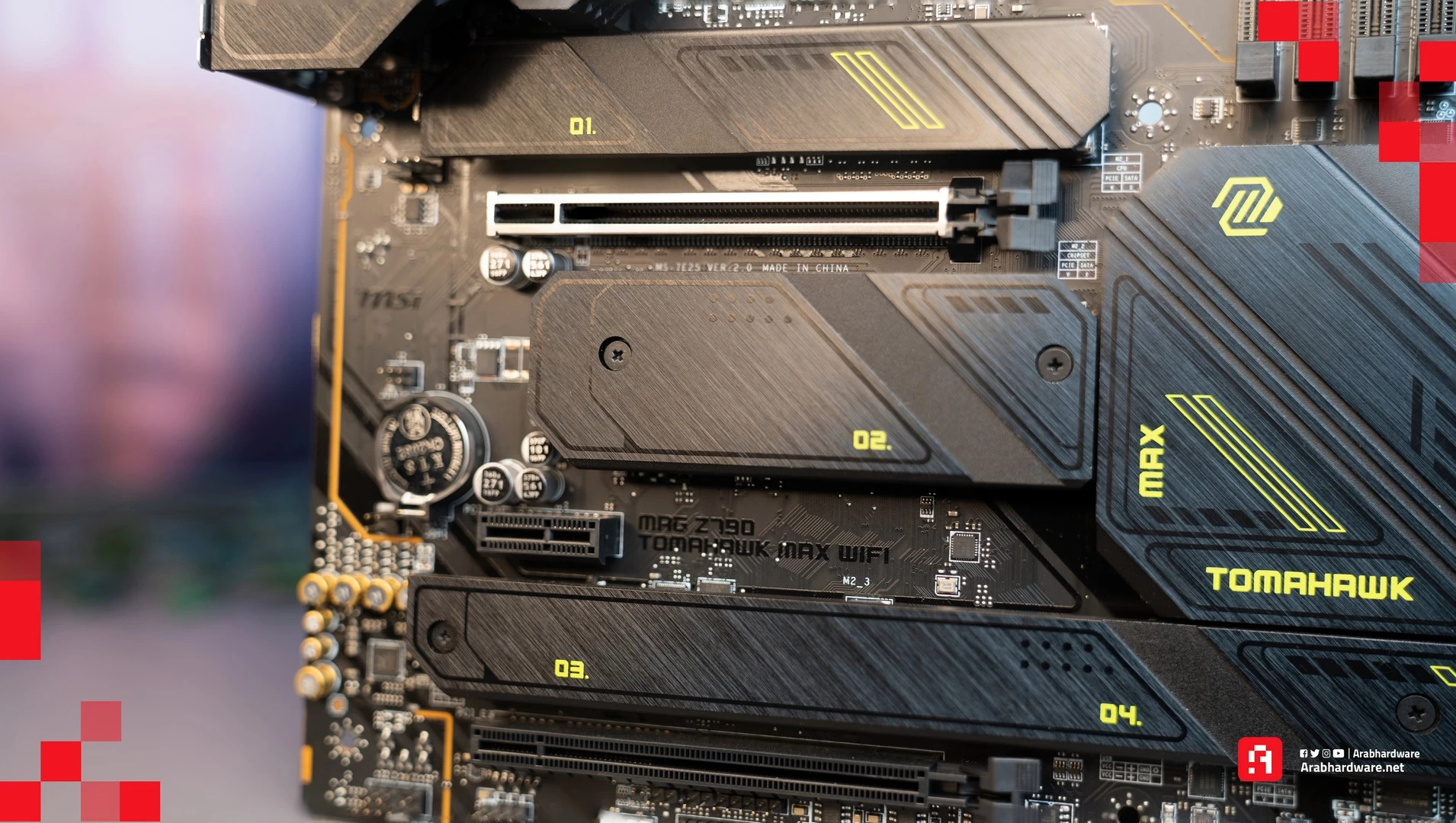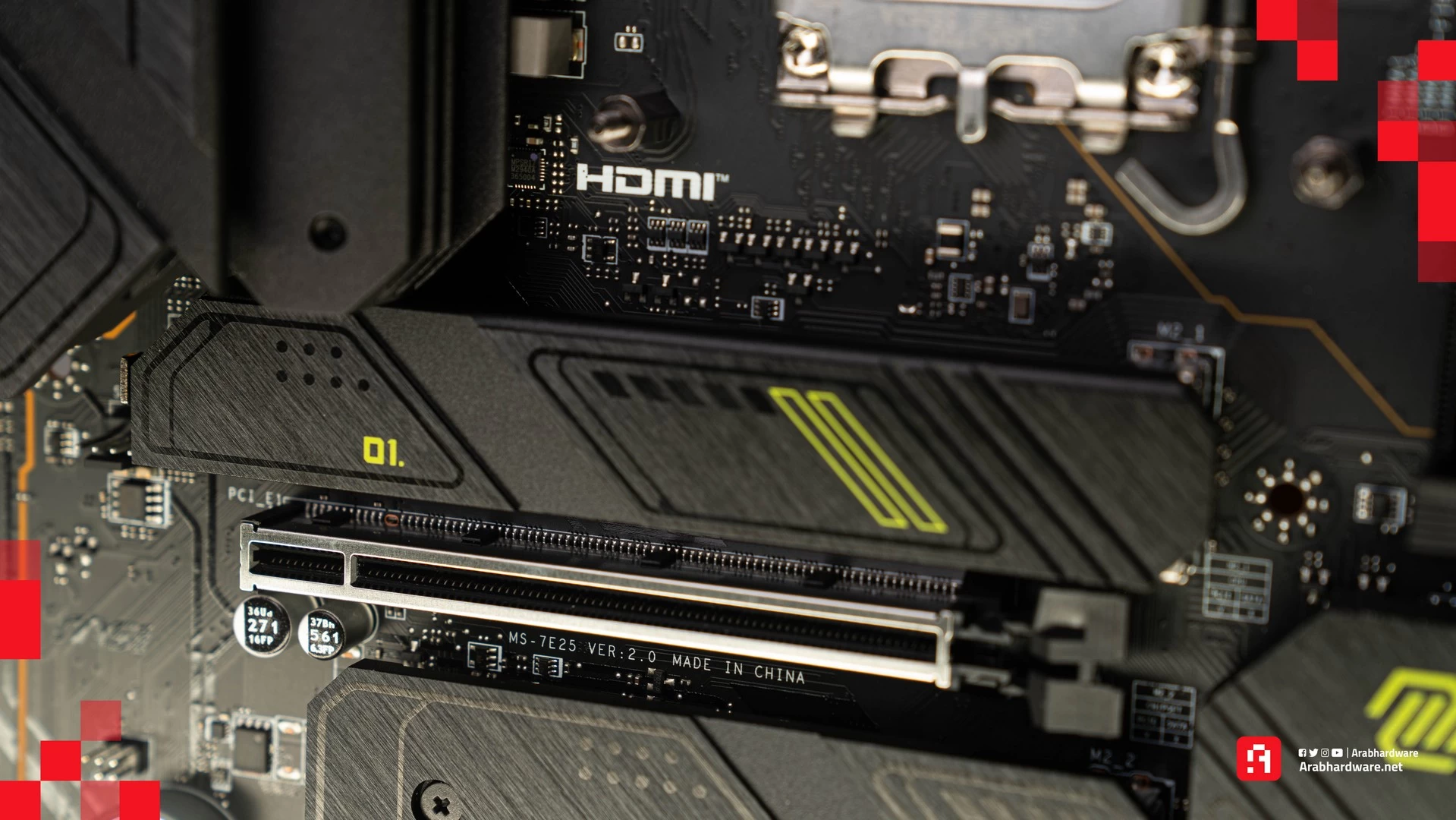 الأمر الآخر الذي قد تلاحظه هنا هو عدد فتحات PCIe القليلة في اللوحة، وذلك بسبب انشغال هذا الجزء بمنافذ M.2 ومُبرّداتها التي تشغل مساحة الـPCB التي تكون عادّة مُخصّصة لمنافذ التوسعة. لكن بالرغم من ذلك فاللوحة توفّر لك المُهم، حيث تأتي مع فتحة PCIe أساسية من الجيل الخامس بسرعة x16. بجانب فتحة PCIe 4.0 x16 (كهربائية x4) وفتحة PCIe 3.0 x1 تم وضعهما أسفل اللوحة للسماح بتركيب البطاقات الكبيرة (ذات الثلاث فتحات) في الفتحة الأساسية العُلوية.