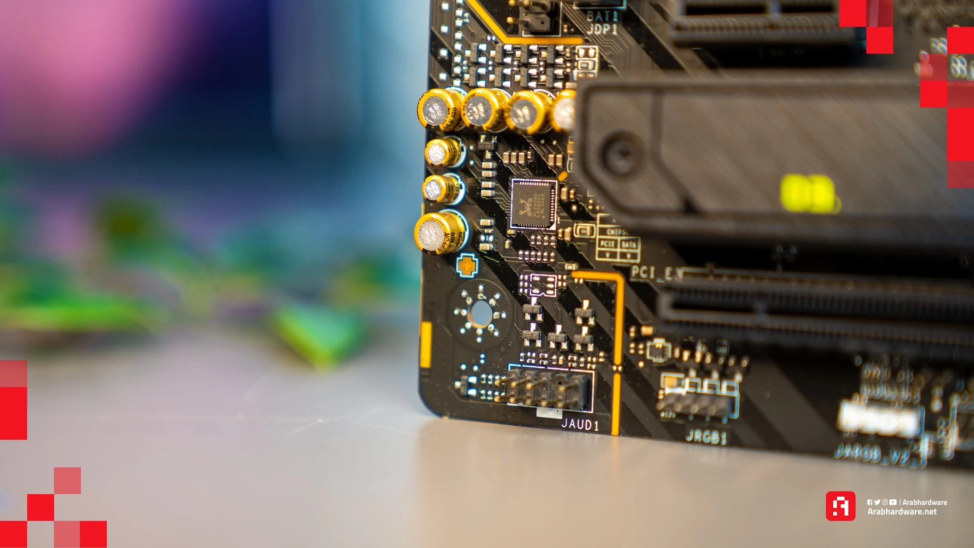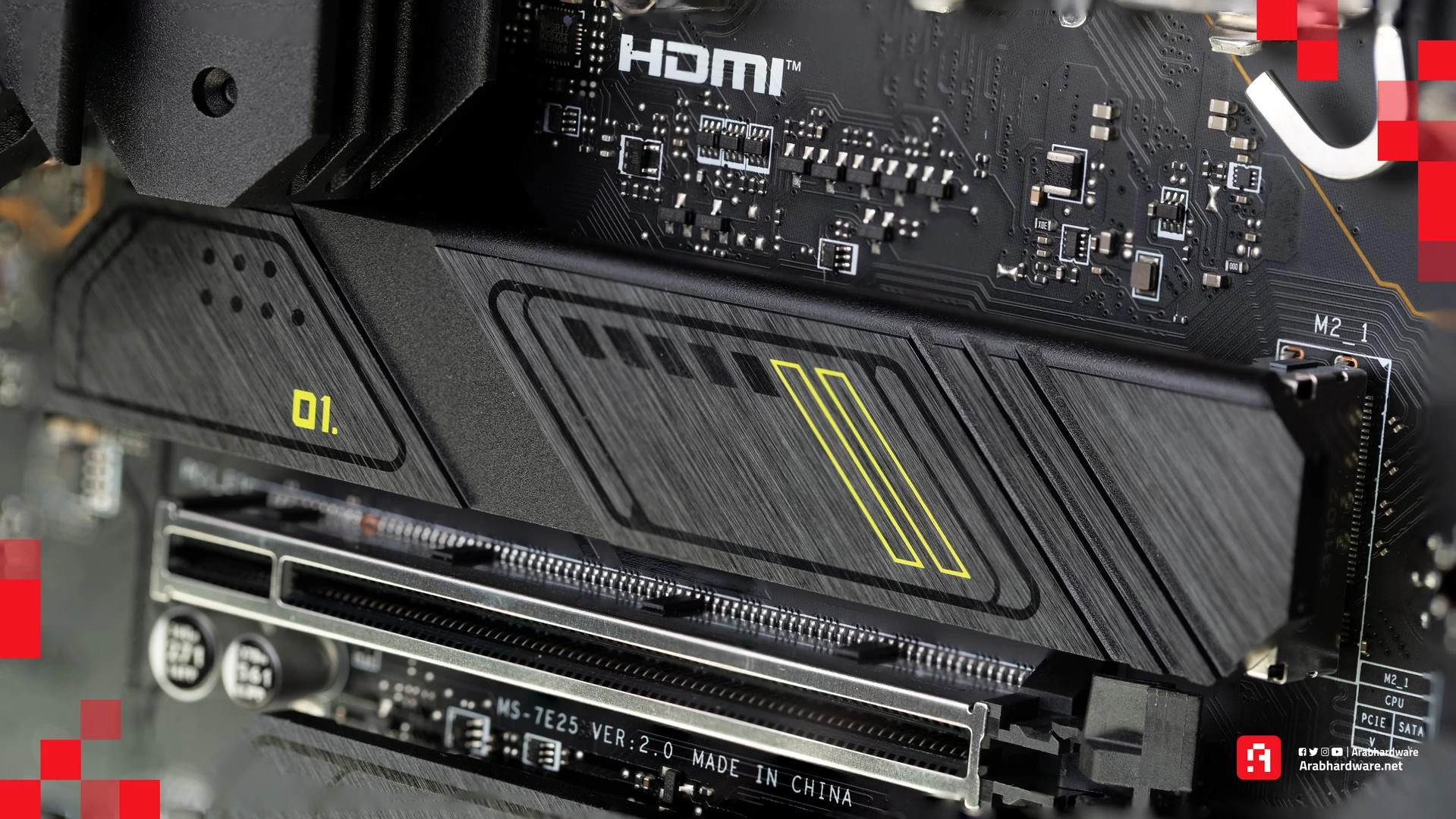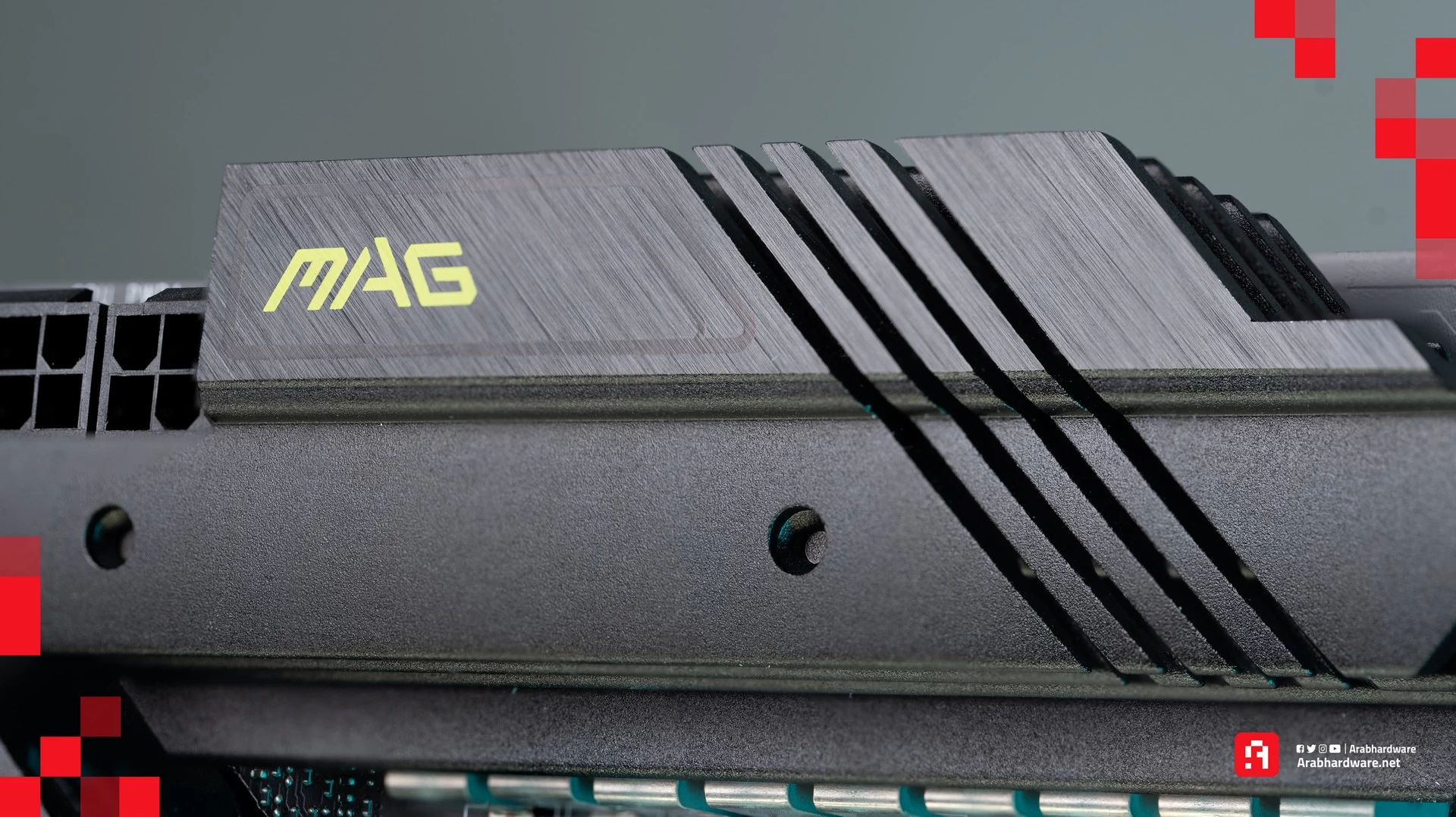 الأمر الآخر الذي قد تلاحظه هنا هو عدد فتحات PCIe القليلة في اللوحة، وذلك بسبب انشغال هذا الجزء بمنافذ M.2 ومُبرّداتها التي تشغل مساحة الـPCB التي تكون عادّة مُخصّصة لمنافذ التوسعة. لكن بالرغم من ذلك فاللوحة توفّر لك المُهم، حيث تأتي مع فتحة PCIe أساسية من الجيل الخامس بسرعة x16. بجانب فتحة PCIe 4.0 x16 (كهربائية x4) وفتحة PCIe 3.0 x1 تم وضعهما أسفل اللوحة للسماح بتركيب البطاقات الكبيرة (ذات الثلاث فتحات) في الفتحة الأساسية العُلوية.