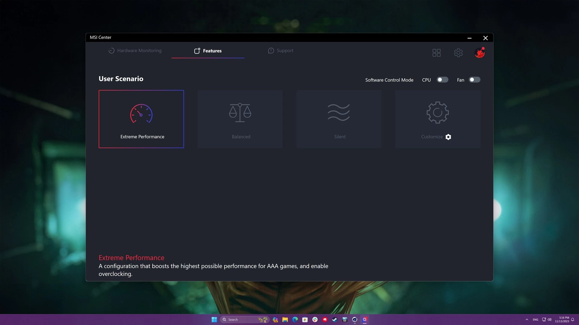 - الوضع المتوازن: هذا الإعداد هو الإعداد الموصى به لمعظم المستخدمين وفقًا لـ MSI، حيث يوازن بين الأداء والطاقة والحرارة.