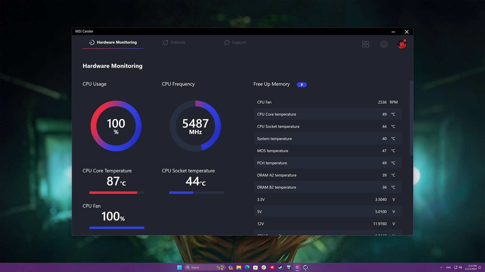 بعد ذلك قمنا باختبار المعالج تحت ضغط 100%، وحصلنا على درجات حرارة 87 درجة للمعالج عند تردد 5487MHz وسرعة المروحة 100% كما يظهر في الصورة، مع درجات حرارة باقي المكوّنات في حدود الـ45-50 درجة مئوية.