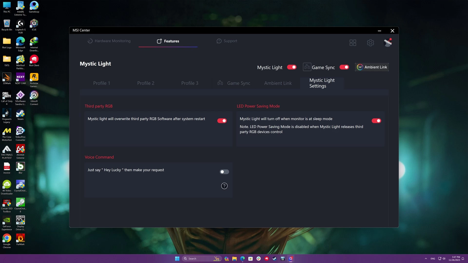 الضوء الغامض Mystic Light: تتيح لك ميزة Mystic Light التحكم في إضاءة LED لمنتجات MSI والمنتجات الشريكة، كما سيُمكّنك أيضاً من ربط نظام الإضاءة بالألعاب أو بالأجهزة المُحدّدة. بالنسبة لبعض المنتجات السابقة، يمكنك زيارة صفحة تنزيل المنتج لتنزيل برنامج التحكم في LED القابل للتطبيق.