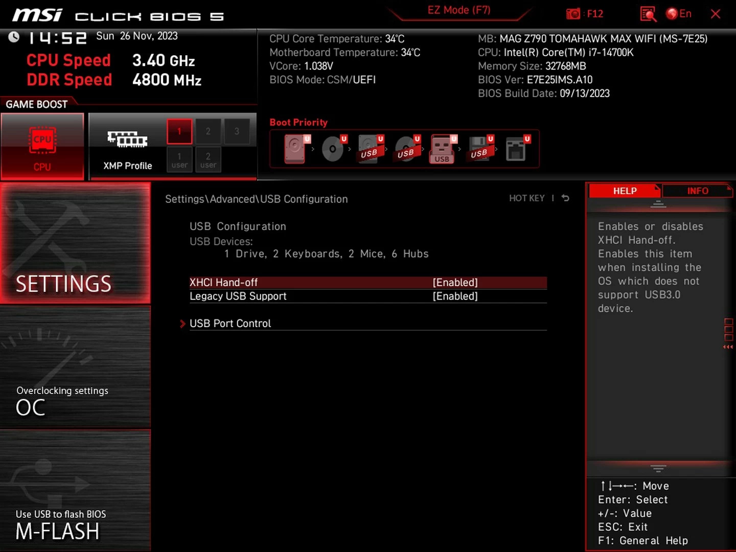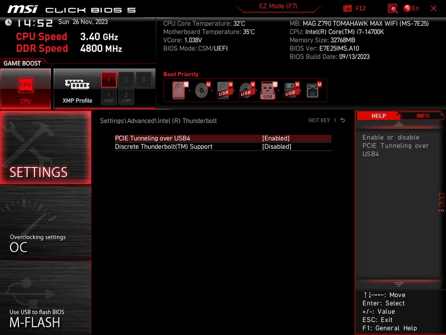 خيارات Thunderbolt: أمّا ما يلي ذلك فهي خيارات Thunderbolt، والتي تختص بخيارات التوصيل الخارجي أو الداخلي للتقنية. وأيضاً خيارات USB، التي نجد فيها الأجهزة الموصّلة، وخيارات كل منفذ على حده، وأيضاً خيارات دعم USB القديمة وغير ذلك.
