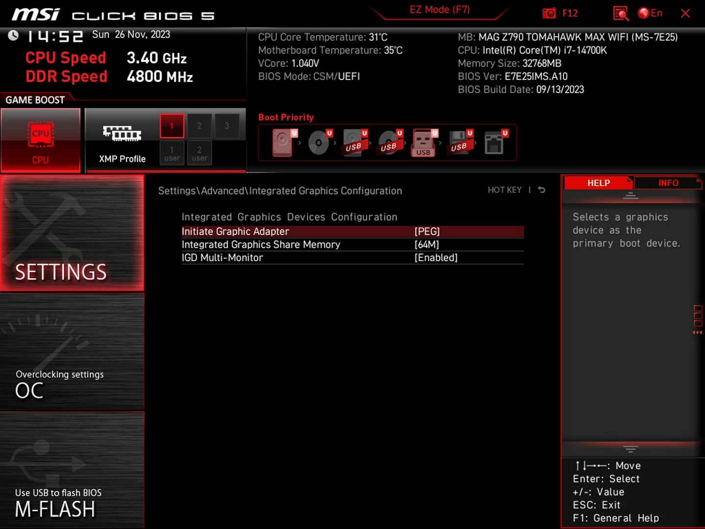 خيارات Integrated graphics configurations: المجموعة التالية هي Integrated graphics configurations، وهي مجموعة من الخيارات الخاصّة بالكارت الشاشة المُدمج، وستجد هناك خيارات مثل تفعيل المعالج الرسومي المدمج أو عدمه، القدرة على تحديد الذاكرة المتصلة به، وخيار تفعيل الشاشات المُتعدّدة.