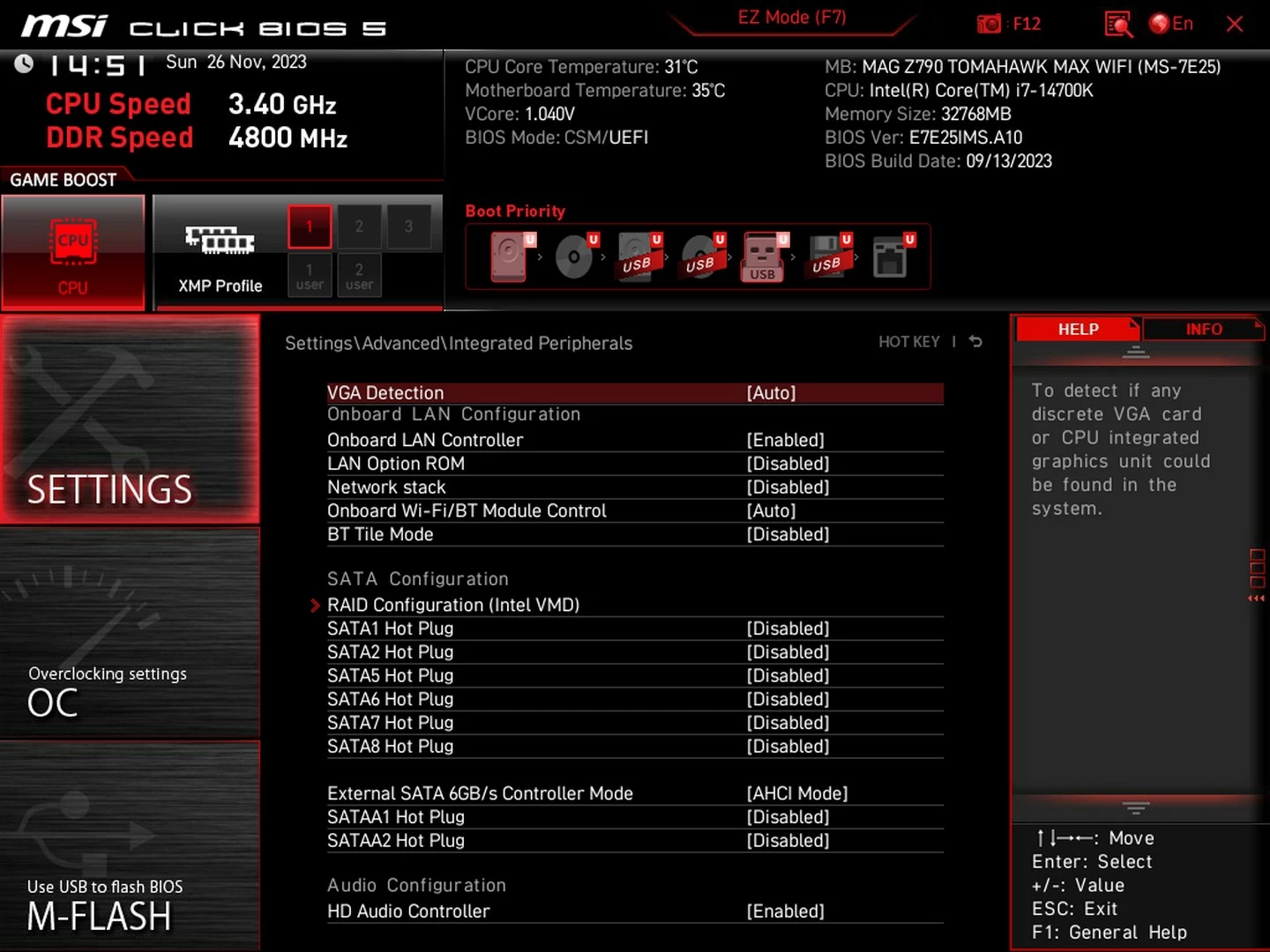خيار Integrated Peripherals: الخيار التالي في القائمة هو خيار Integrated Peripherals، وهو الخيار الذي يسمح لك بالتحكم في مجموعة من الأمور المُرتبطة بمنافذ التوسعة والمنافذ الخلفية وغيرها من الأجهزة والأجزاء الطرفية. خيارات للتحكم في أمور مثل شبكة الإيثرنت، الـWiFi 7، أو حتى البلوتوث 5، كل ذلك ستجد خياراته هناك. هذا بالطبع إلى جانب خيارات وحدات الـSATA، مثل خيارات Raid وخيارات النزع السريع لوحدات الـSATA، وأخيراً وليس آخراً خيارات الصوت الرئيسية.