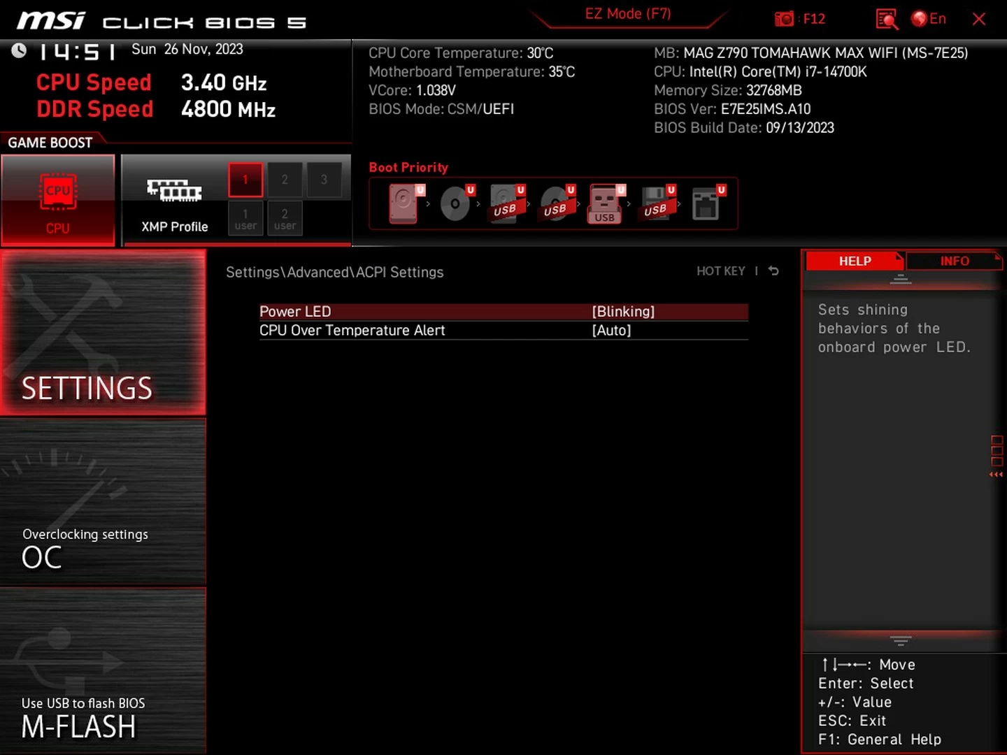 خيارات ACPI : الخيار التالي بعد ذلك أمامنا هو خيار ACPI الذي يمكّنك من التحكّم في طبيعة إضاءة زر التشغيل، وأيضاً تنبيه درجة حرارة المعالج المبالغ فيها.