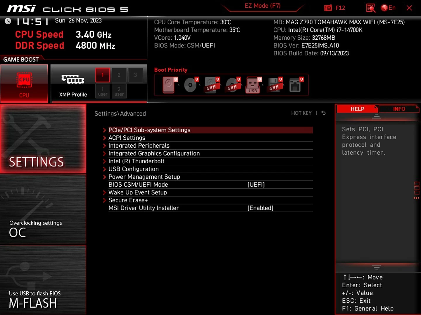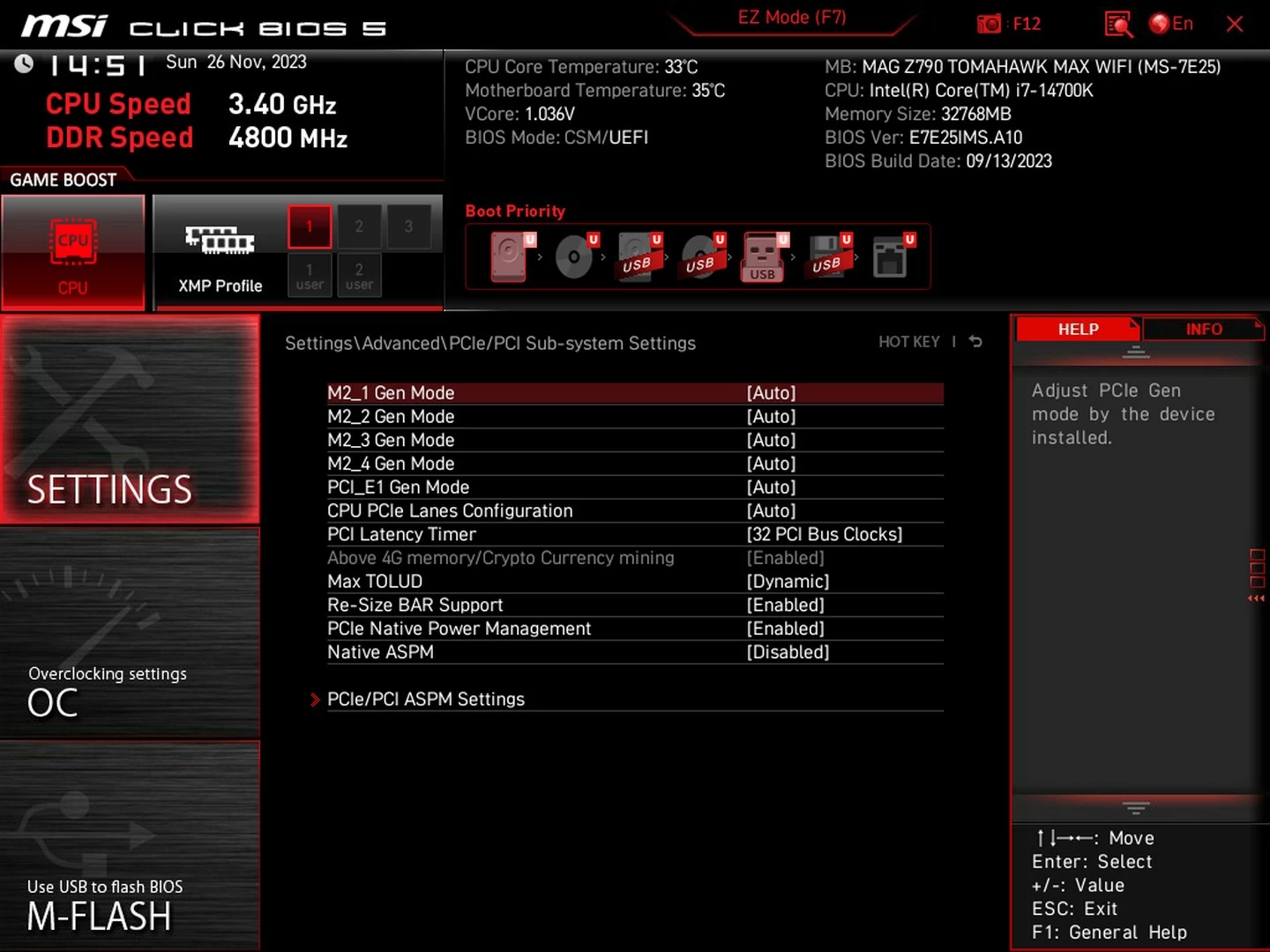 خيارات PCIe الأساسية: وهي الشاشة التي نستطيع من خلالها تعديل وضعية منافذ PCIe الخاصة بكارت الشاشة أو وحدات التخزين M.2، أو حتى خيار تفعيل Re-Size Bar (المعروفة في لوحات AMD باسم SAM)، وغيرها من خيارات الطاقة والخيارات الأخرى الخاصة بمنافذ التوسعة بشكلٍ عام.